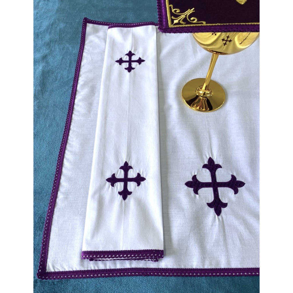 O conjunto de alfaias da Litua é composto por 4 peças: Pala, manustérgio, sanguineo e corporal. A pala mede 17x17, bordado em alta definição, com parte interna rígida e removível, facilitando sua lavagem. O sanguíneo mede 33x43, confeccionado em tecido encorpado, resistente com aplicação de renda passamanaria roxa. Corporal 50x50 com o mesmo tecido do sanguíneo ( 100% algodão ) Bordado na parte inferior central e aplicação de renda passamanaria roxa. Manustérgio 30x45 cm da marca Dohler, com tecido de boa absorção. NÃO DEFORMA AO LAVAR, RENDA E TECIDO PRÉ ENCOLHIDO.