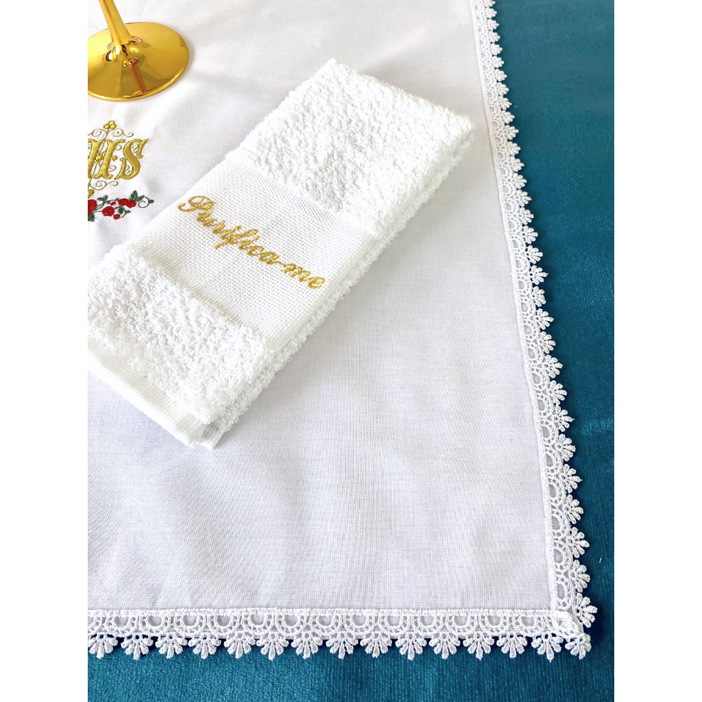 O conjunto de alfaias da Litua é composto por 4 peças: 1 Pala, 1 manustérgio, 1 sanguineo e 1 corporal. A pala mede 17x17, bordado em alta definição, com parte interna rígida e removível, facilitando sua lavagem. O sanguíneo mede 33x43, confeccionado em tecido encorpado, resistente com aplicação de renda guipire. Corporal 50x50 com o mesmo tecido do sanguíneo ( 100% algodão )e aplicação de renda guipire. Manustérgio 30x45 cm da marca Dohler, com tecido de boa absorção. NÃO DEFORMA AO LAVAR, RENDA E TECIDO PRÉ ENCOLHIDO.