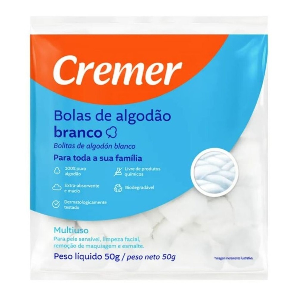 As Bolas de Algodão Cremer são confeccionadas com fibras 100% algodão. Macias e com ótimo poder de absorção, seu formato arredondado é ideal para a limpeza da pele do bebê e a remoção de esmaltes e cosméticos.