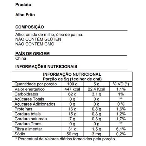 Alho Frito – Sabor Intenso e Crocância para seus Pratos O Alho Frito é um ingrediente versátil que adiciona sabor marcante e textura crocante às suas receitas. Perfeito para temperar carnes, saladas, molhos e petiscos, é uma opção prática para realçar o sabor dos alimentos com um toque especial. ℹ Benefícios: - Sabor intenso e aroma característico do alho - Textura crocante que realça pratos diversos - Prático e fácil de usar - Versátil para diversos tipos de receitas - Produto natural, sem conservantes artificiais - Pronto para consumo ℹ Ficha Técnica: - Produto: Alho Frito - Ingredientes: Alho frito em óleo vegetal, sal - Conservação: Manter em local seco e fresco - Embalagem: Pote ou saco plástico selado - Produto natural e pronto para consumo *Imagem ilustrativa. O produto pode apresentar variações de cor, sabor e aparência, conforme as características naturais das matérias-primas e diferenças entre as safras do ano.