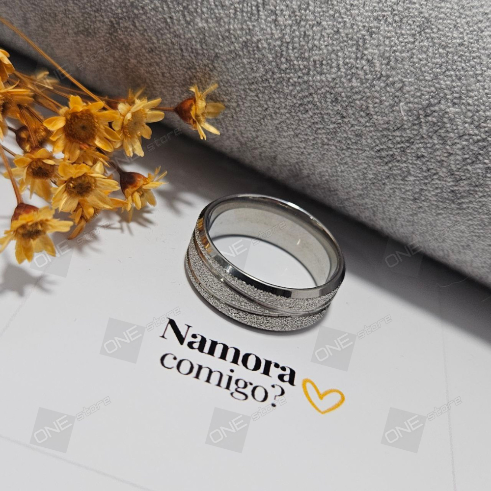 Aliança de Casamento Jateada Prateada com Friso Ondular e Diamantada Aço Inox Larga 8mm