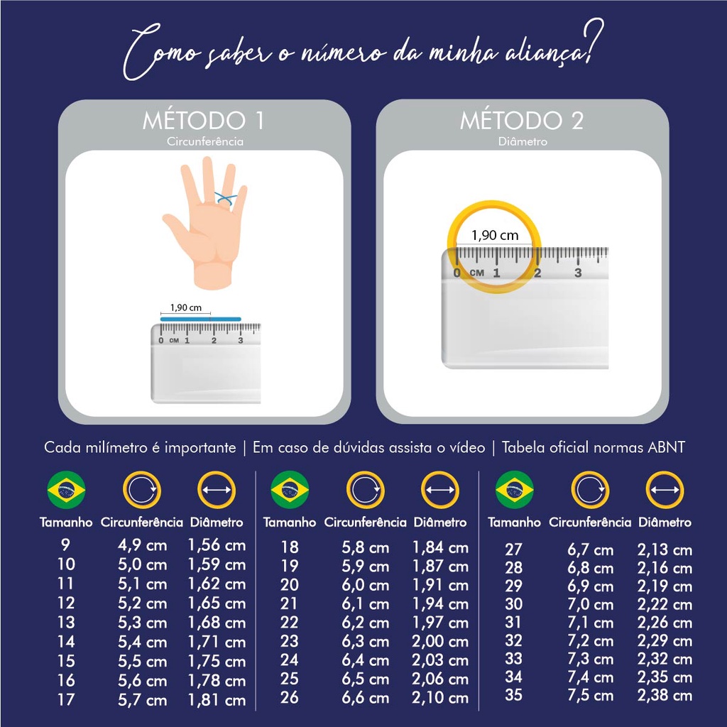 Aliança de noivado/casamento em liga de moeda antiga abaulada lisa 6MM com forro em aço inox. GT.5267 Material: liga de moeda antiga e aço inox/cirúrgico. Acabamento: liso. Formato externo: abaulado. Formato interno: anatômico. Largura: 6mm. Espessura: 3mm. Peso (aproximado, pois pode variar de acordo com as numerações): 4g. Numeração: do 12 ao 33. O que acompanha: 1 unidade de aliança, 1 saquinho de veludo e 1 certificado de garantia. COMO SEI MEU NÚMERO? Existem métodos simples e fáceis para você tirar a medida do seu dedo em sua casa, assim como mostramos em nossa tabela e em nosso vídeo explicativo do Youtube com o título: 3 Formas de Medir seu Dedo. *Cada detalhe é de extrema importância: sempre considere a régua a partir do zero e leve em consideração cada risquinho, pois a numeração muda a cada 1mm. JÁ SEI MEU NÚMERO, COMO INFORMAR? Após escolher os números, é só selecioná-los nos campos tamanho e finalizar a compra. *Se os campos não estiverem disponíveis informe as numerações desejadas pelo chat liberado pós compra. VOCÊS GRAVAM NOME E DATA? Sim, gravamos sem custo, mas recomendamos que solicite somente se tiver certeza das numerações já que não efetuamos a troca / aceitamos devolução de alianças personalizadas. *Estando ciente dos termos e desejando a gravação é só entrar em contato conosco no chat com o vendedor que é liberado pós compra e passar as informações para realização da mesma. E SE NÃO SERVIR, TEM COMO TROCAR? Como o site não tem opção de troca você tem que solicitar a devolução sem custo (exceto se estiver gravada) informando que não serviu, ser reembolsado e caso queira realizar uma nova compra com a numeração correta. TEM GARANTIA? Claro, sempre prezamos pela qualidade em nossos produtos e nos responsabilizamos, dentro de 6 meses, por qualquer defeito de fabricação. Excluindo-se o mal uso, como a perda de pedras, quebras, arranhões e amassados ou quando o produto for reparado por pessoas que não sejam de nossa assistência. AS ALIANÇAS DE MOEDA ANTIGA ESCURECEM? Assim como a prata, as alianças de liga de moeda podem escurecer ou perder o brilho quando em contato com ácido úrico (substância encontrada em nosso organismo), por isso, as nossas alianças contam com um forro de aço inox/cirúrgico que restringe o contato com a pele e evitam o escurecimento das mesmas. Mas, se mesmo assim ocorrer perda de brilho ou alteração de cor, um breve polimento (que pode ser feito em casa ou em joalherias) fazem elas voltarem ao seu brilho e cor original. As alianças de liga de moeda, assim como o próprio nome diz, são fabricadas com moedas antigas, as quais eram confeccionadas com a liga de bronze e alumínio, mesmo material utilizado na confecção das medalhas olímpicas de bronze. Benefício das alianças de liga de moeda antiga: 1. Não descasca; 2. Não causa alergias; 3. Resistência e durabilidade; 4. Aparência de ouro/ beleza visual; 5. Excelente custo benefício.