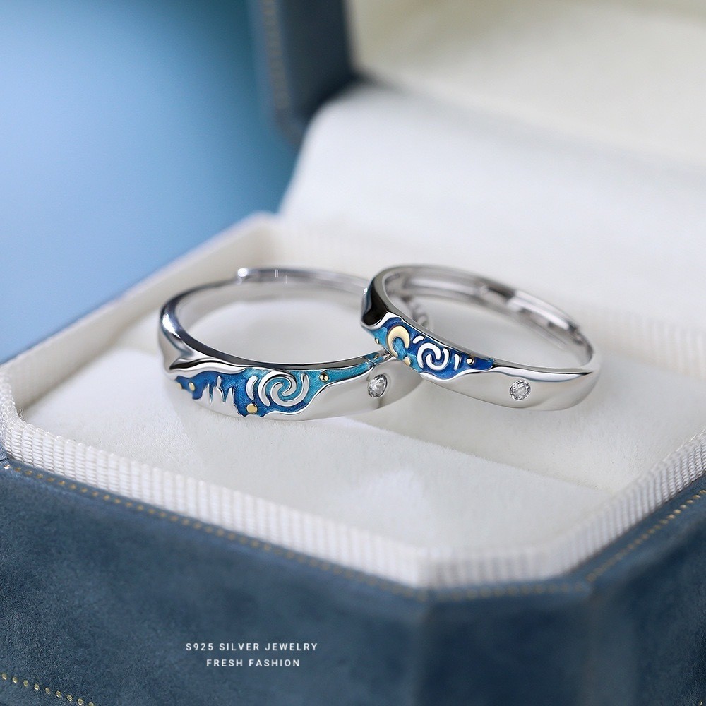 Aliança Prata 925 Van Gogh de Namoro Ajustável Anel Casal Van Gogh Estampa Noturna Estrelada