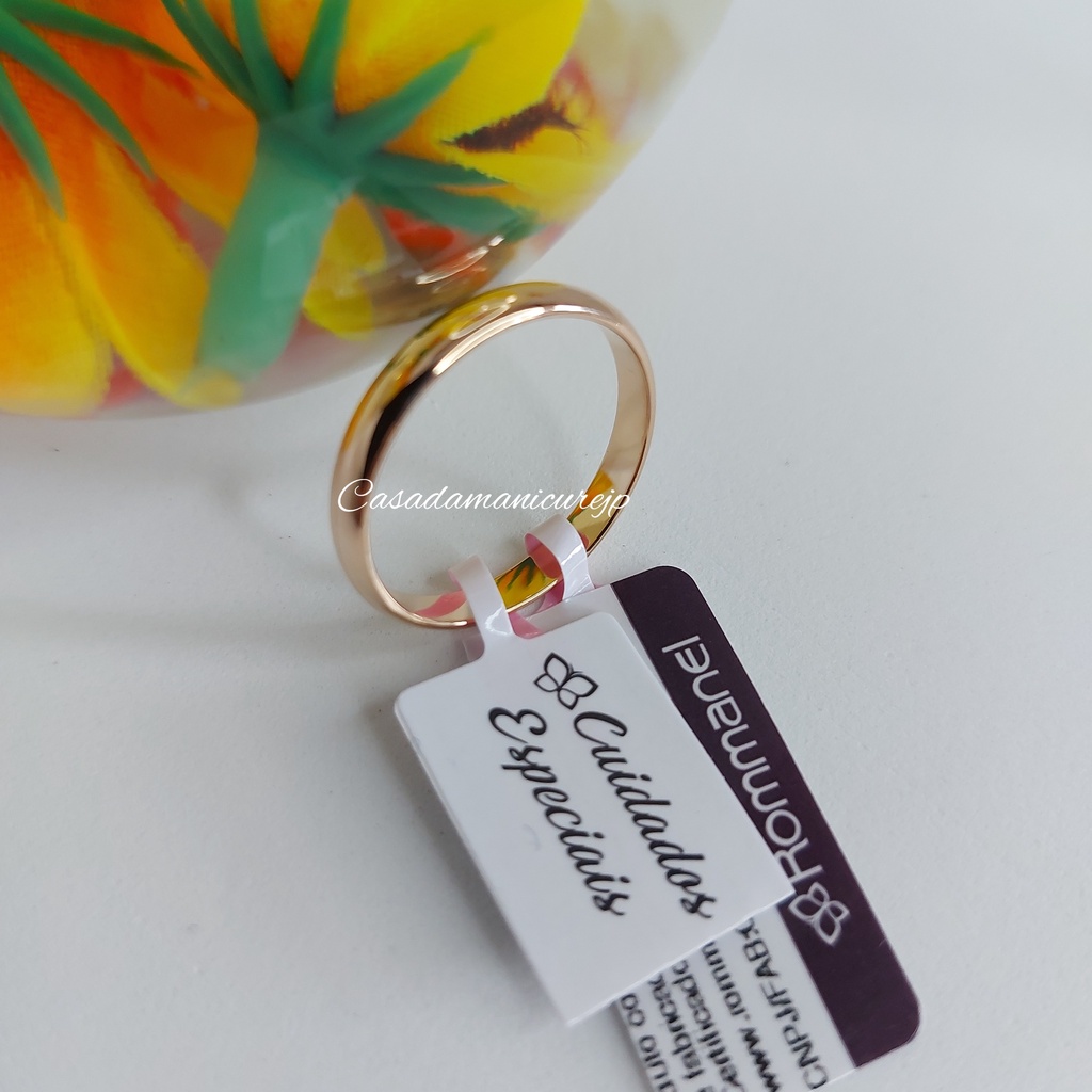 Descrição Aliança fina lisa meia cana Mede 3mm de espessura. Produtos_____Folheado a ouro 18k Faixa etária___Adulto Tema________Básicos Conceito____A coleção permanente rommanel tráz jóias tradicionais, que independem da moda para serem atuais! os três banhos de ouro garantem as jóias rommanel satisfação e acabamento similar ao ouro maciço. esse diferencial faz com que alianças,anéis e outros modelos tenham lugar garantido Espessura___3mm Estilo________Aliança Formato_____Liso Categoria____Alianças PRODUTO 100% ORIGINAL DA ROMMANEL, ACOMPANHA O CERTIFICADO DE GARANTIA ROMMANEL COMO IDENTIFICAR UMA JÓIA AUTENTICA ORIGINAL ROMMANEL A autenticidade da joia Rommanel está garantida em cada peça com a presença da borboleta, símbolo da qualidade dos produtos. A identificação é feita nas tarraxas dos brincos, nas contra-argolas dos cordões e pingentes, bem como na parte interna dos anéis uma borboleta minuscula em baixo relevo. Ao comprar uma joia folheada Rommanel verifique se ela está corretamente identificada e acompanhada da etiqueta com código de barras exclusiva e certificado de garantia. OBS: SE FICAR NA DÚVIDA, PODE VERIFICAR A AUTENTICIDADE E ORIGINALIDADE DA PEÇA EM QUALQUER LOJA ROMMANEL JOIAS HIPO-ALERGÊNICAS A NÍQUEL O níquel é um metal que pode desencadear dermatite alérgica, reação que provoca coceira e vermelhidão na pele. Por isso, a empresa adotou os padrões internacionais para a confecção de suas joias, firmando seu compromisso de peças 100% livres de níquel e chumbo em sua composição. SINÔNIMO DE QUALIDADE A ROMMANEL é sinônimo de qualidade. Isso porque suas joias são fabricadas com as melhores matérias-primas e tem acabamento artesanal de joalheria. Na fabricação das joias é utilizada a mais moderna tecnologia de eletrodeposição de metais. O controle desse processo é feito com laboratórios e maquinário de última geração, oferecendo a seus consumidores produtos com padrão internacional de qualidade. A ROMMANEL PRODUZ JOIAS FOLHEADAS A OURO 18K, JOIAS FOLHEADAS A RHODIUM, JOIAS FOLHEADAS A PLATINA, JOIAS FOLHEADAS A RHODIUM NEGRO E JOIAS EM AÇO. Nossas joias são produzidas dentro dos mais rigorosos padrões de qualidade. A espessa camada de ouro 18k e/ou rhodium depositadas em nossas peças – superior à média de mercado – garante acabamento similar ao de uma joia maciça e uma durabilidade superior , em relação a outras joias folheadas. No entanto, recomendamos alguns cuidados que vai descrito no certificado de garantia para manter sua joia sempre como nova. BANHO DE OURO A quantidade de ouro, associada a alta tecnologia com acabamento artesanal, assegura que a qualidade da joia Rommanel seja muito superior à média do mercado. Cada peça recebe 3 camadas de ouro e passa por análise minuciosa para certificar a quantidade depositada. Esse compromisso garante que as joias possam ser utilizadas por muito tempo, permanecendo como novas.