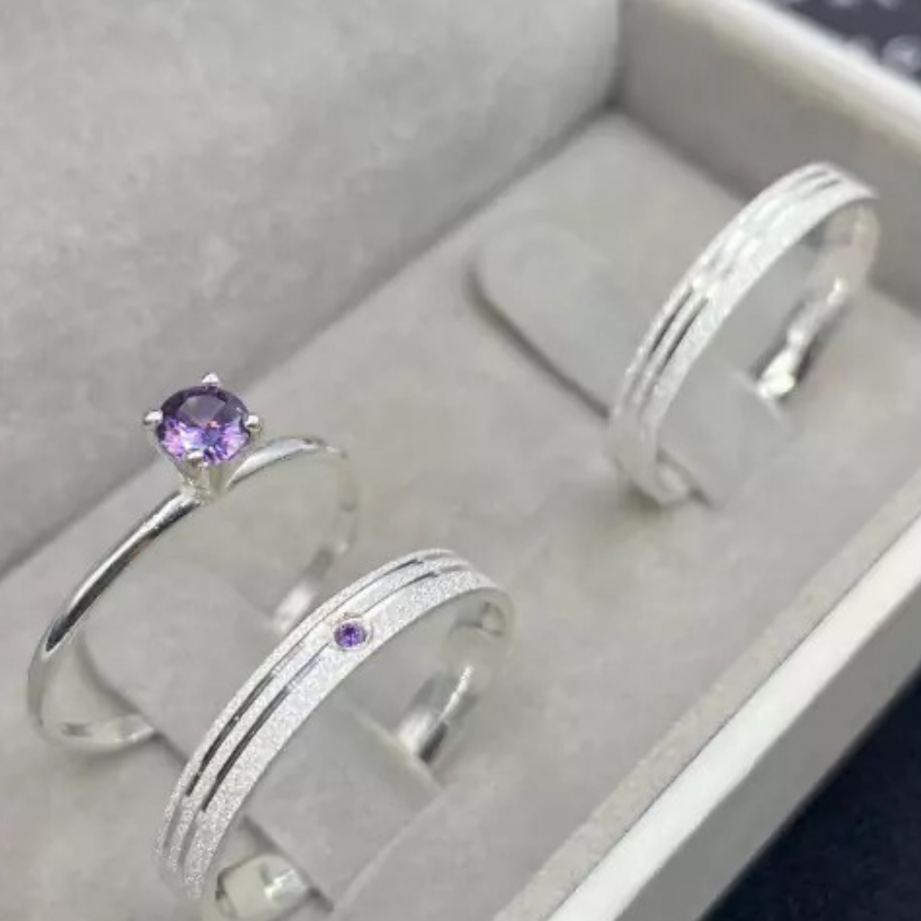 Alianças de Namoro e Compromisso em Prata950 Cravejada pedra roxa 3mm Fina e Anel Solitário lilas