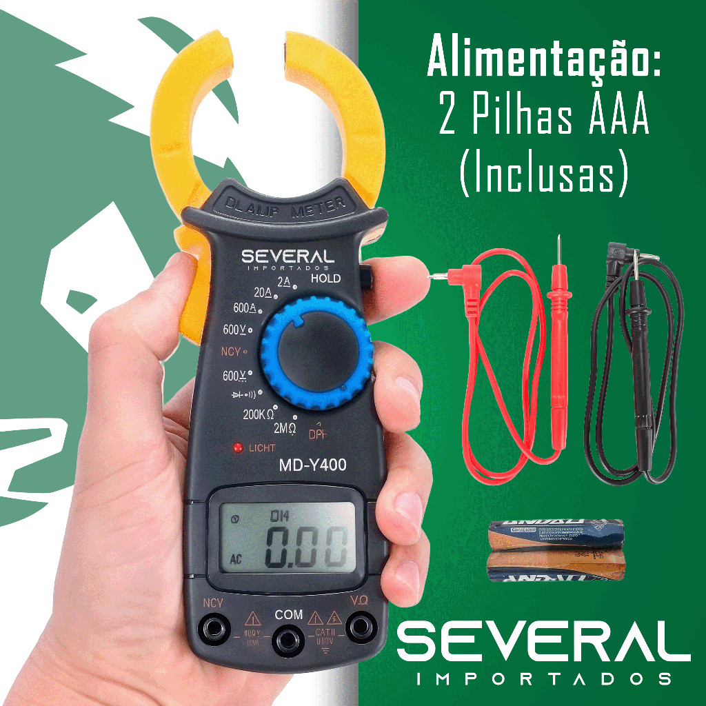 Alicate Amperímetro Destribuido pela Several Importados MD-Y400 O Alicate Amperímetro MD-Y400 pode realizar medição de CA de até 600A, com uma grande abertura de garra de até 55mm. É uma ferramenta ergonômica, fácil de usar e atende todas as suas necessidades cotidianas de manutenção elétrica. ESPECIFICAÇÕES TÉCNICAS: - Funções: Tensão contínua e alternada, corrente alternada, resistência, isolação, teste de continuidade, teste de diodos. - Polaridade: Automática. Sinal negativo (-) será exibido automaticamente - Indicação de sobrecarga: O dígito “1” mais significativo é exibido - Indicação de bateria gasta: O visor exibirá o símbolo de bateria gasta quando restar aproximadamente 10% de energia útil - Temperatura de operação: 0° a 50°C - Alimentação: 2 pilhas AAA 1.5v (inclusas) - Abertura máxima do alicate: 55mm - Modelo: Alicate Amperímetro - Cor: Preto e amarelo - Tensão DC: 600V - Corrente AC: 2/20 - Resistência: 200kOHM - Resistência de isolação: 2m - Visor: cristal líquido (LCD) 3 ½ dígitos (1999) - Dimensões: 17,5 x 5,5 x 2,5 cm - Peso: 120g CONTEÚDO DA EMBALAGEM: - 1 Alicate Amperímetro Digital MD-Y400 - 2 Ponteiras de Teste - 2 Pilhas AAA 1.5v - 1 Manual Garantia do vendedor: 30 dias