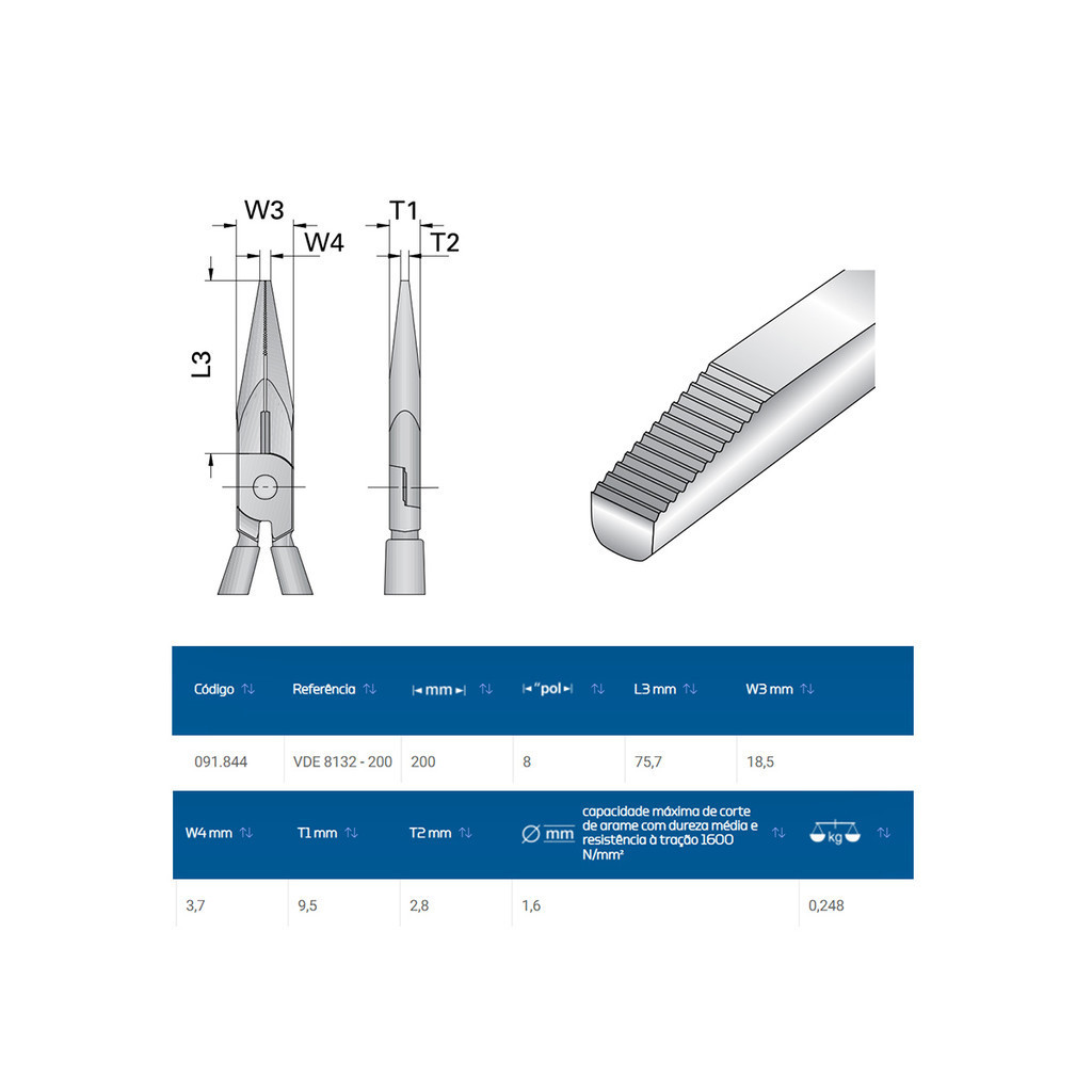 Alicate Bico Meia Cana 8" 1000V Gedore VDE 8132-200 Descrição: - Corpo em aço Gedore-Vanadium e empunhadura em polímero anti-chamas; - Acabamento niquelado, cromado e polido; - Empunhadura ergonômica, com abas protetoras arredondas para maior conforto e segurança; - Utilizar ferramentas isoladas VDE, em tensão máxima de 1000 V em corrente alternada e 1500 V em corrente contínua, conforme norma EN 60900 / IEC 60900; - Possui dupla camada de isolação Check-Tool, no exterior é na cor vermelha, padrão Gedore; - Atende com segurança a norma regulamentadora NR 10 - Segurança em Instalações e Serviços em Eletricidade, possui certificado de isolação; - Tratamento térmico total e corte temperado por indução com dureza de 61 - 63 HRC. Alicate de bico semirredondo, longo e reto, com dentes finos e em paralelo, que permite cortar, puxar, segurar e dobrar fios; - Indicado para corte de arame com dureza média, diâmetro máximo de Ø 1,6 mm e com resistência à tração 1600 N/mm²; - Para trabalhar em montagens e reparos eletroeletrônicos. Dados Técnicos: - Marca: Gedore; - Modelo: 091844; - Referência: VDE 8132-200; - Comprimento do alicate: 20cm ou 8"; - Capacidade máxima de corte de arame com dureza média e resistência à tração 1600 N/mm²: 1,6mm; - Peso: 0,248Kg. Componentes Inclusos: - 01 Alicate Bico Meia Cana 8" 1000V Gedore VDE 8132-200.