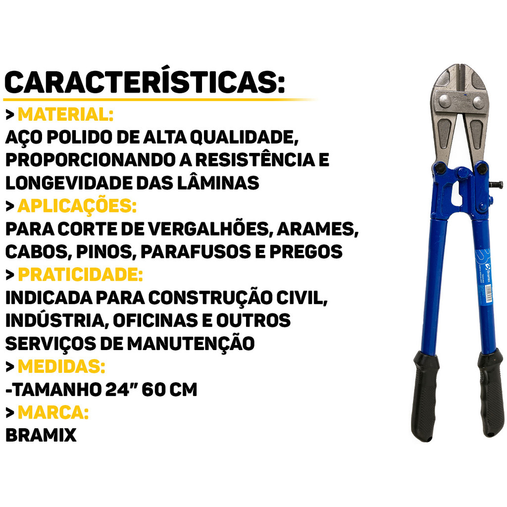 Tesoura Corta Vergalhão 24 Polegadas Bramix A Tesoura Corta Vergalhão da Bramix é uma ferramenta indispensável para quem busca qualidade, precisão e conforto em suas tarefas de corte. É fabricada em aço polido de alta qualidade, oferecendo resistência e durabilidade. Características: > Design compacto e leve, fácil de manusear e transportar; > Ideal para o uso em obras, reformas e serviços de manutenção; > Cabo ergonômico com revestimento antiderrapante para maior conforto e segurança; > Mecanismo de alavanca que reduz o esforço necessário para cortar materiais resistentes; > Lâminas afiadas para cortes precisos em vergalhões, arames, cabos, pinos, parafusos, pregos, entre outros. - Marca: Bramix - Garantia: 90 dias contra defeitos de fabricação Vantagens de comprar na Brester: - Produto a pronta entrega. - Produto novo, com garantia de fábrica. - Nota fiscal para Pessoa Física e Pessoa Jurídica.