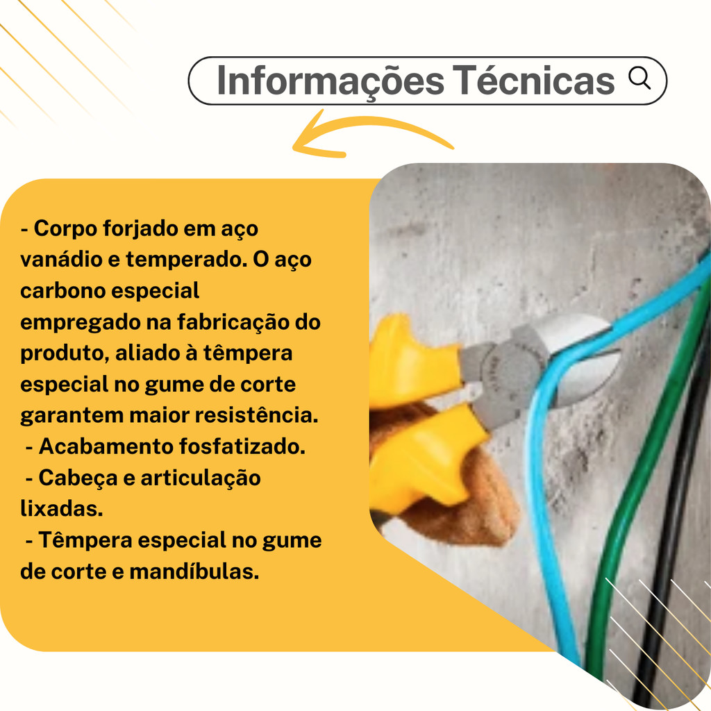 Bem vindo!! Você está em uma loja especializada em soluções automotivas seguras e confiáveis. Aqui, cada detalhe é pensado para cuidar do que move você: sua família, sua segurança e seus melhores momentos na estrada. ✂️ Alicate Corte Diagonal 6" Tramontina Master – Isolado 1000 V O Alicate Corte Diagonal 6” Tramontina MASTER garante alta resistência, durabilidade e precisão no corte de fios e arames. Com corte diagonal e gume tratado termicamente, é uma ferramenta essencial para uso profissional e doméstico. 📦 Conteúdo da Embalagem 🔧 1 Alicate Corte Diagonal 6" Tramontina Master 🏷 Marca TRAMONTINA 🧾 Código da Peça 31790 /41006106 📐 Especificações Técnicas 🔧 Tipo: Alicate corte diagonal 6" 🔩 Corpo forjado em aço vanádio e temperado: resistência superior 🛠️ Aço carbono especial com têmpera no gume: mais durabilidade 🌑 Acabamento fosfatizado 🔍 Cabeça e articulação lixadas ✂️ Têmpera especial no gume de corte e mandíbulas ⚡ Isolação 1.000 V (NBR 9699 e NR10): seguro para trabalhos elétricos 🔄 Articulação suave: facilita o uso ✋ Cabos ergonômicos isolados em PVC amarelo: conforto e segurança 🧪 Ferramentas produzidas e testadas conforme normas específicas 🛠️ Aplicações ⚡ Corte de Fios e Cabos Elétricos Para fios de cobre, alumínio e demais condutores. A isolação evita choques acidentais. 🔌 Manutenção Elétrica Profissional Cortes precisos em locais de difícil acesso, como painéis e caixas de distribuição. 💻 Eletrônica e Reparos em PCI Cortes limpos em cabos e componentes eletrônicos. 🏠 Instalações Residenciais, Industriais e Comerciais Desempenho confiável em ambientes de trabalho intensivo. 🧱 Construção Civil Corta arames, cabos de aço e outros materiais metálicos em obras. 🚗 Aplicações Automotivas Perfeito para corte de fios e cabos elétricos veiculares. ⭐ Benefícios Adicionais 💪 Durabilidade e Resistência: Aço forjado com longa vida útil. ✋ Conforto e Segurança: Empunhadura isolada em PVC (até 1000 V). 👁️ Alta visibilidade: Cabo amarelo facilita a localização da ferramenta. ⚠️ Aviso Legal 🚫 Proibimos o uso, cópia ou alteração de nossas fotos, imagens e conteúdo presentes nos anúncios. 📜 Conforme a Lei 9.610/98, qualquer violação será tratada legalmente, pois possuímos direitos autorais sobre este material.
