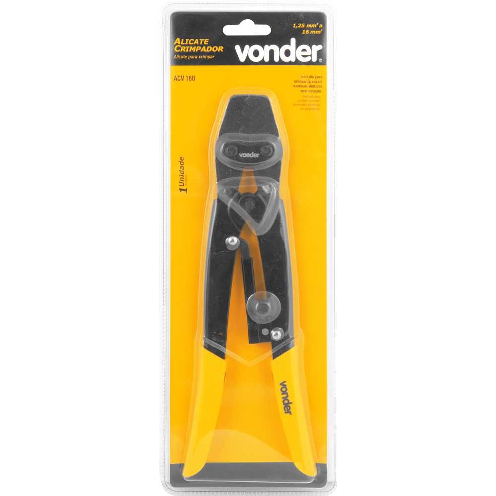 Alicate crimpador, terminais sem isolação, 1,25 mm² a 16,0 mm², ACV 160, VONDER Possui acabamento fosfatizado, proporcionando resistência a corrosão/oxidação. Indicado para crimpar (prensar) terminais elétricos sem isolação. Especificações Técnicas: Modelo: ACV 160 Capacidade do alicate crimpador: 1,25 mm² a 16 mm² Material do corpo do alicate: Aço liga Acabamento: Fosfatizado preto Comprimento do alicate crimpador: 11" (279 mm) Tipo do cabo do alicate.: Cabo plastificado Tipo de compressão: Manual Tipo de terminal: Sem Isolação Massa aproximada (peso) (kg): 0,476 kg Conteúdo Da Embalagem: 1 Alicate crimpador.