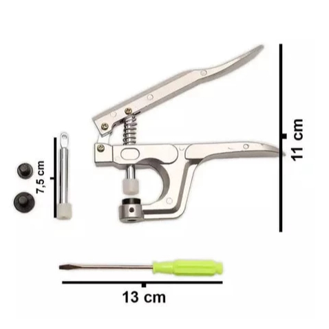 Alicate para aplicação de botões de pressão de plástico Ritas de 3 tamanhos: 10mm, 12mm e 15mm. Sendo leve e prático, esse alicate de pressão é fácil de usar, basta encaixar o botão de plástico onde será a fixação do botão, ajeitar a matriz e pressionar. Esse produto também inclui: - 3 Matrizes - 1 Chave de Fenda - 1 Haste Adicional Comprando até às 12:00 fazemos o envio no mesmo dia. Envio direto de São Paulo! Produto pronto para entrega Envio Rápido! Duvidas envie uma mensagem via chat, responderemos mais rápido possível.