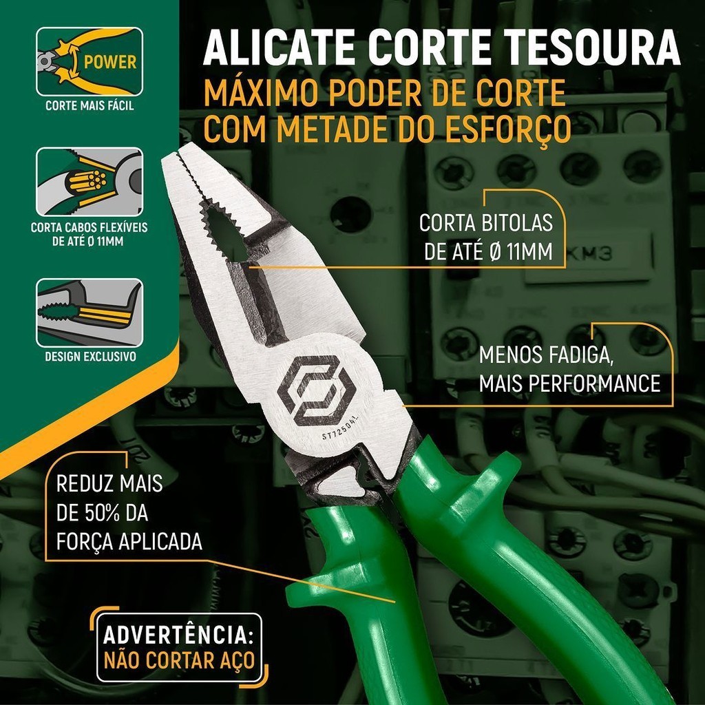 Alicate de Corte Tesoura 8” ST72504L Sata Descrição do produto: - Seu Design “tesoura” inédito no Brasil reduz em mais de 50% a força a ser aplicada durante o corte de cabos flexíveis de bitolas de até Ø 11mm externo; - Performance superior com menos fadiga; - Alicate Corte Tesoura Profissional Isolado 8" - SATA é indicado para trabalhos de manutenção elétrica, como prensar terminais e cortar fios e cabos; - Obs: Contraindicado para uso mecânico e não corta aço. Vantagens: - Ideal para corte de cabos flexíveis de cobre em instalações elétricas; - Arestas de corte tipo tesoura: precisas, afiadas, permitem corte de bitolas maiores; - Ranhuras deep grip paralelas para melhor agarre de fios e capas isolantes. Bico com ranhuras cruzadas: agarre seguro em qualquer posição, sem escape; - Cabo isolado, proporcionando segurança nas aplicações em locais com tensão de até 1000V; - Fabricado em aço Cromo-Vanádio (Cr-V) para maior durabilidade e resistência. Capacidade de corte: - Cabos flexíveis de bitolas de até Ø 11mm externo; - Fio de cobre rígido: Ø2. Dados técnicos: - Marca: Sata; - Modelo: ST72504L; - Material: Aço Cromo-Vanádio (Cr-V) e Plástico; - Tamanho: 8 Polegadas; - Comprimento: 22,00cm; - Largura: 6,00cm; - Altura: 3,50cm; - Peso: 0,39Kg. Componentes inclusos: - 01 Alicate de Corte Tesoura 8” ST72504L Sata.