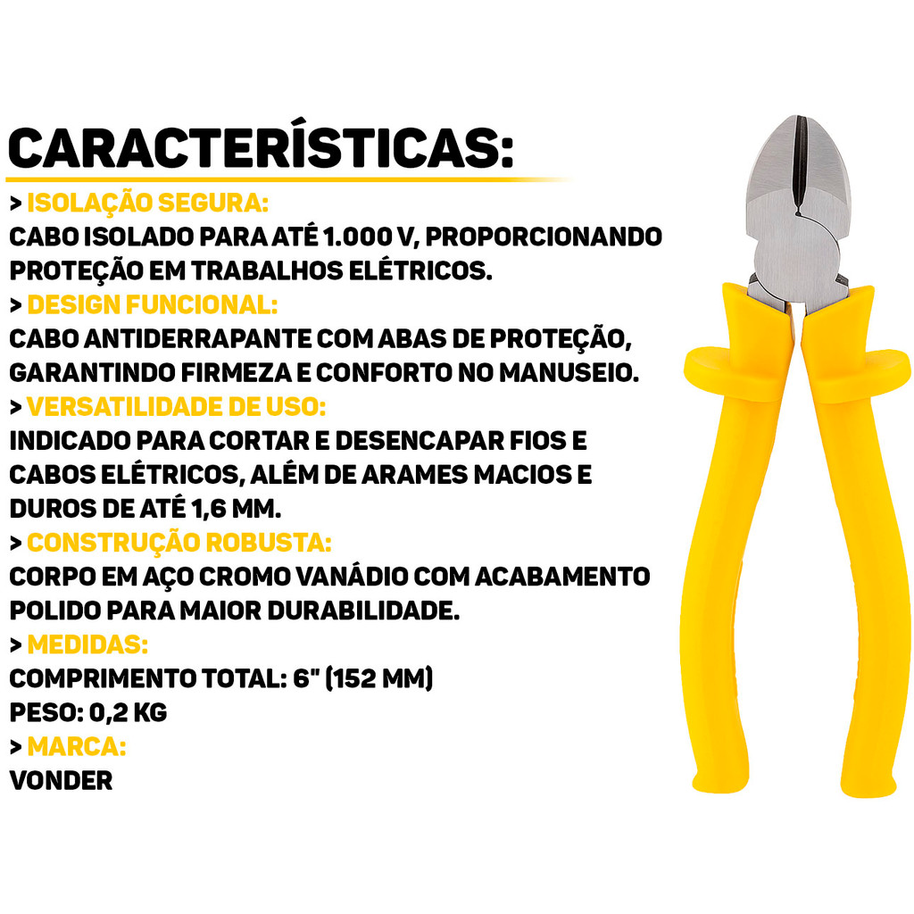 Alicate De Corte Diagonal 6 Polegadas Vonder Isolado 1000v Profissional P/ Fios E Cabos Elétricos
