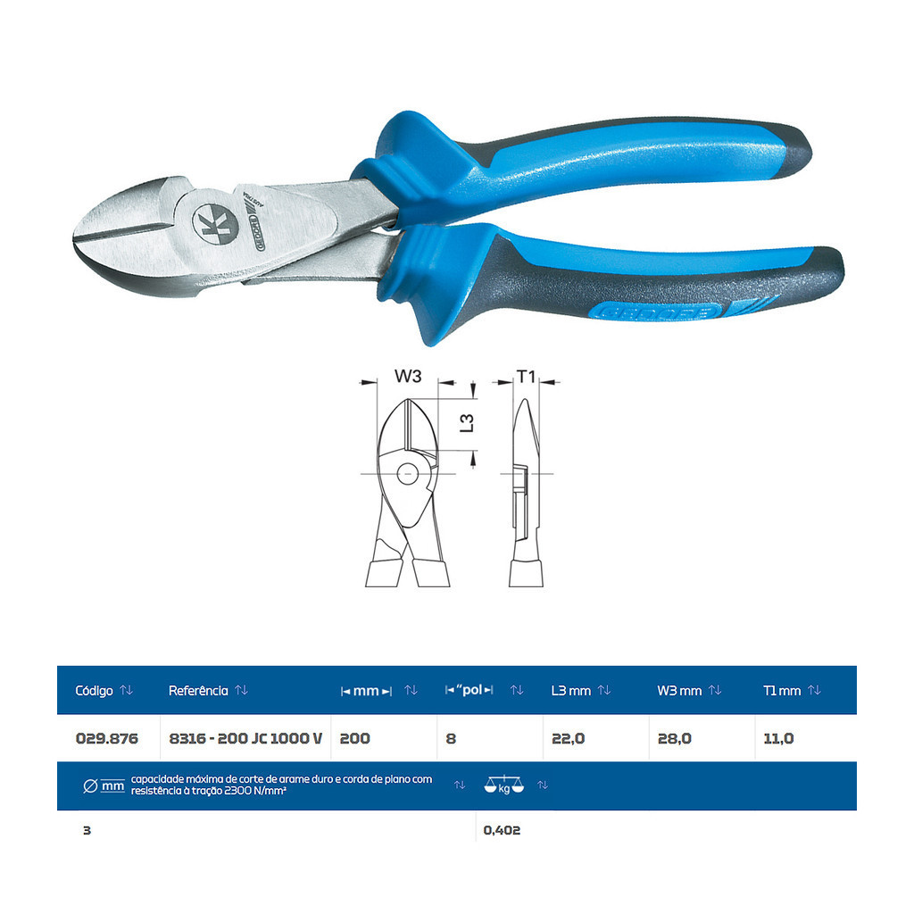 Alicate de Corte Diagonal Americano 8" Gedore 8316-200JC Descrição: - Alicate de Corte Diagonal com mordente Americano Isolado com sistema Kraft de 8"; - O sistema Kraft “Power Pliers”, permite capacidades mais elevadas de corte, com 35% menos de força do usuário, devido à combinação ótima da geometria de corte, alojamento excêntrico e grande efeito alavanca; - Indicado para corte de arame duro e corda de piano com diâmetro máximo de Ø 2,0 mm e com resistência à tração 2300 N/mm²; - Utilizar este Alicate isolado, em tensão máxima de 1000 V em corrente alternada e 1500 V em corrente contínua, conforme norma NBR 9699; - A geometria do corte está posicionada em diagonal ao corpo do alicate; - Propicia máximo rendimento com corte mais facilitado; Vantagens: - Corpo em aço Gedore-Vanadium e empunhadura em polímero anti-chamas nas cores azul e preto, padrão Gedore; - Acabamento niquelado e cromado. Empunhadura ergonômica e antideslizante, com abas protetoras arredondadas para maior conforto e segurança; - Tratamento térmico total e corte temperado por indução com dureza de 63 - 65 HRC, permitindo corte preciso; - Produzida por injeção, propiciando isolação até 1000 V, conforme norma NBR 9699, submetida à ensaios de: tensão elétrica, aderência, inflamabilidade e pressão/penetração. Dados Técnicos: - Marca: Gedore; - Modelo: 029876; - Referência: 8316-200JC; - Cor: Azul e preto; - Composição: Aço Cromo-Vanádio e Polímero; - Comprimento do alicate: 200mm - 8"; - Comprimento da mordaça: 22mm; - Largura da mordaça: 11mm; - Peso: 0,34Kg. Componentes Inclusos: - 01 Alicate de Corte Diagonal Americano 8" Gedore.