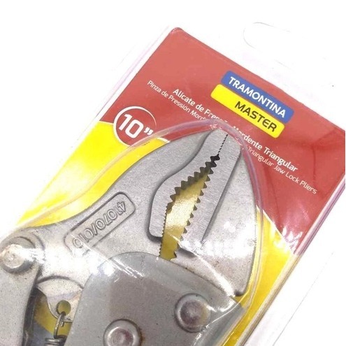 Alicate de Pressão 10" Tramontina com Mordente Triangular 41070/110 O Alicate de Pressão 10 polegadas Tramontina com mordente triangular é a ferramenta que faltava em seu kit. Um item que vai facilitar muito mais o corte, solda, lixa e outros trabalhos que precisem que o objeto esteja fixado. Possui sistema de trava que aciona assim que o objeto é preso. É produzido em aço especial com têmpera e seus mordentes possuem perfil triangular. Uma ferramenta de alto desempenho que prende, trava e não solta! Mordentes forjados em aço especial e temperados. O aço carbono especial empregado na fabricação dos mordentes, aliado à têmpera garantem maior resistência. Corpo formado por chapas conformadas. Acabamento cromado. Abertura regulável. Possui alavanca para destravar. Mordentes com perfil triangular. Sistema de rebites especialmente projetado para aumentar a resistência do produto. Formato ergonômico para maior conforto. As ferramentas são produzidas e testadas conforme normas específicas. REF:41070/110