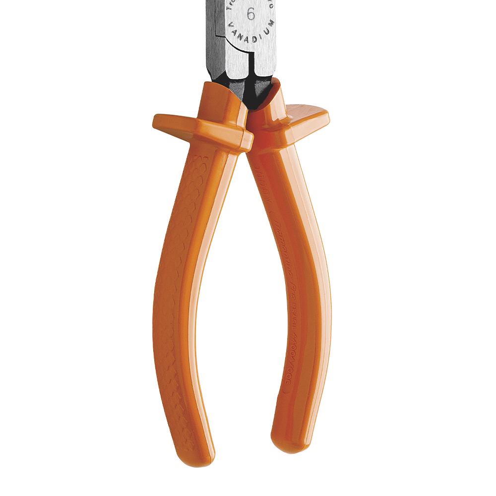 Por ter o bico longo, é muito utilizado nos serviços elétricos e de telefonia. Sua mandíbula possui espaço para corte de arames e espaço serrilhado para pegar objetos e mantê-los firmes. A ferramenta certa para você que trabalha na indústria ou oficinas mecânicas. Forjado em aço cromo vanádio. Cabeça e articulação polidas. Têmpera total no corpo. Têmpera por indução no gume de corte.Isolação elétrica de 1.000 V CA. Produto em conformidade com a NBR9699 e NR10.DIN ISO 5745.Os alicates de corte são testados quanto à resistência ao desgaste do gume de corte em máquina de ensaio específica.Os alicates possuem dureza diferenciada no gume de corte e no corpo.Os alicates também são testados com relação à aderência das empunhaduras de PVC.Um ensaio de extrema importância analisa o grau de isolação do revestimento aplicado sobre os cabos dos alicates isolados, e que promove segurança na sua utilização em locais com tensões de até 1.000 V CA.Cortar, prender e dobrar cabos e arames.Utilizado em trabalhos de telefonia.As ferramentas são produzidas e testadas conforme normas específicas. Por ter o bico longo, é muito utilizado nos serviços elétricos e de telefonia. Sua mandíbula possui espaço para corte de arames e espaço serrilhado para pegar objetos e mantê-los firmes. A ferramenta certa para você que trabalha na indústria ou oficinas mecânicas.