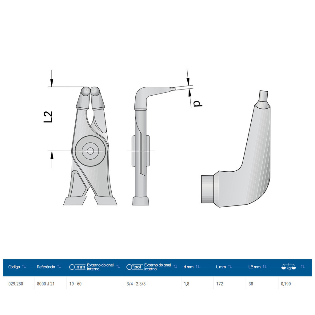 Alicate para Anéis 7" Interno Curvo 90° Gedore 8000J21 Descrição: - Corpo em aço Gedore-Vanadium e empunhadura plastificada na cor azul padrão Gedore; - Acabamento escurecido; - Alicate com pontas fixas e curvas 90º; - Para anéis de segurança internos conforme norma DIN 472 e DIN 984. Dados técnicos: - Marca: Gedore; - Modelo: 029280; - Referência: 8000J21; - Externo do anel interno: 19 - 60mm ou 3/4 - 2.3/8"; - Comprimento total do alicate: 17,2cm ou 7"; - Peso: 0,19Kg. Componentes Inclusos: - 01 Alicate para Anéis 7" Interno Curvo 90° Gedore 8000J21.
