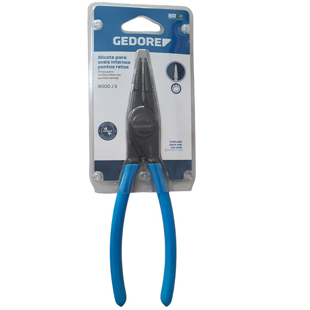 Alicate para Anéis 9" Interno Reto Gedore 8000J3 Descrição: - Corpo fabricado em aço GEDORE-Vanadium com acabamento escurecido; - Empunhadura plastificada; - Alicate com pontas fixas e retas; - Para anéis de segurança internos conforme norma DIN 472 e DIN 984. Dados Técnicos: - Marca: Gedore; - Modelo: 029285; - Referência: 8000J3; - Externo do anel interno: 40 - 100mm ou 1.5/8 - 4"; - Comprimento total do alicate: 23,2cm ou 9"; - Peso: 0,27Kg. Componentes Inclusos: - 01 Alicate para Anéis 9" Interno Reto Gedore 8000J3.