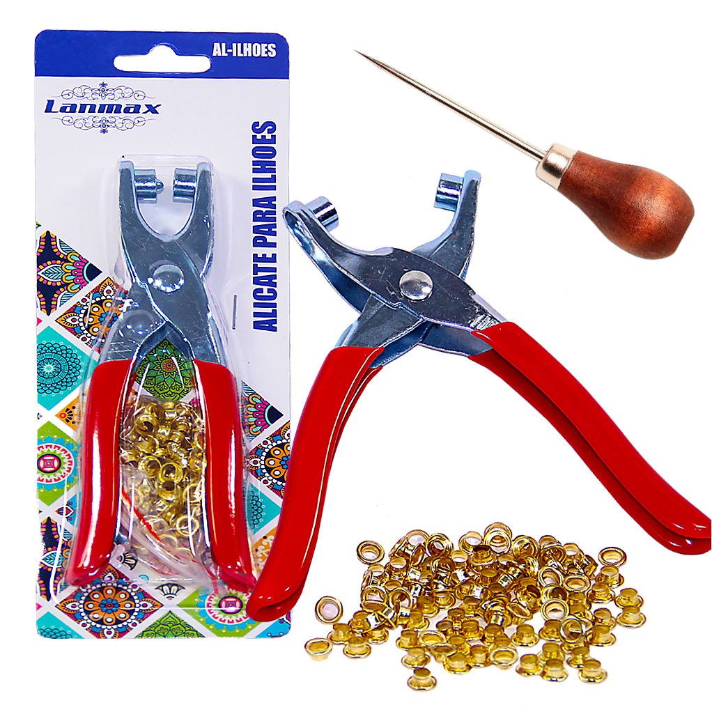 Alicate Para Aplicar Ilhós Lanmax + 100 Ilhós Dourado + Agulhão