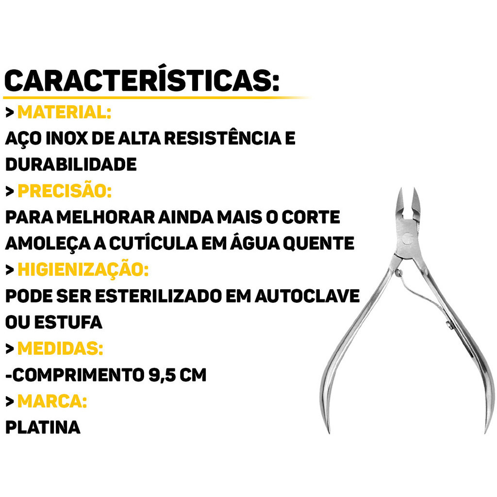 Alicate De Cutícula Em Aço Inox 9,5cm Platina Sabemos como é importante ter unhas bem feitas, o Alicate De Cutícula da marca Platina é produzido em aço inox, proporcionando durabilidade excepcional. Com lâminas afiadas e design ergonômico, ele garante um corte suave e preciso, sem esforço. Características: > Uso seguro e confortável; > Maior precisão e facilidade para retirar a cutícula; > Excelente poder de corte e de maior durabilidade; > Design ergonômico e exclusivo que facilita o manuseio. Especificações Técnicas: > Material: aço inox; > Dimensões do produto (C x L x A): 9,5cm x 3cm x 1cm. - Marca: Platina - Garantia: 90 dias contra defeitos de fabricação Vantagens de comprar na Brester: - Produto a pronta entrega. - Produto novo, com garantia de fábrica. - Nota fiscal para Pessoa Física e Pessoa Jurídica.