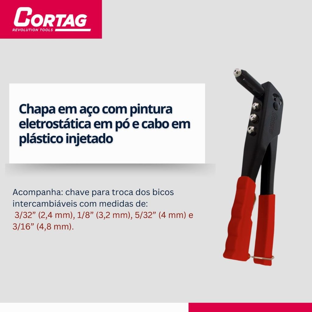 ALICATE REBITADOR MANUAL 4 PONTAS - CORTAG -------------------------------------------------------------------------------- -------------------------------------------------------------------------------- O Alicate Rebitador Manual da Cortag é indicado para a fixação de rebites de repuxo em chapas metálicas, perfis e outras superfícies, garantindo precisão e praticidade no manuseio. PRINCIPAIS CARACTERÍSTICAS: Acompanha chave para troca dos bicos intercambiáveis. Medidas dos bicos: 3/32” (2,4 mm), 1/8” (3,2 mm), 5/32” (4 mm) e 3/16” (4,8 mm). Material resistente: corpo em chapa de aço com pintura eletrostática em pó. Cabo ergonômico em plástico injetado para maior conforto e segurança. -------------------------------------------------------------------------------- DÚVIDAS FREQUENTES Qual a principal aplicação do Alicate Rebitador Manual? O alicate é ideal para fixação de rebites de repuxo em chapas metálicas, perfis e superfícies similares. Os bicos são intercambiáveis? Sim, o produto acompanha chave para troca dos bicos, permitindo o uso de diferentes tamanhos de rebites. O cabo é emborrachado? Não, o cabo é feito em plástico injetado, proporcionando firmeza e conforto no uso.