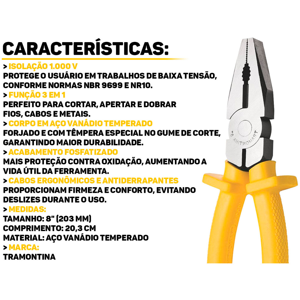 Alicate Universal 8" Isolado 1000V Tramontina Profissional P/ Eletricista Cortar Dobrar E Apertar