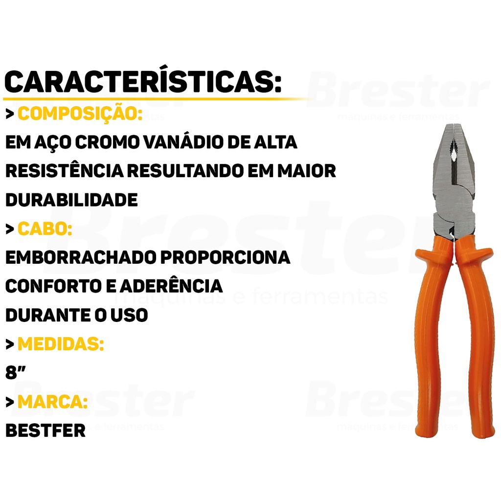 Olá, Bem vindo a Distribuidora Brester. Trabalhamos com uma grande variedade de ferramentas elétricas e manuais, descartáveis, eletroeletrônicos, artigos para casa, artigos de petshop e outros. Aqui você encontrará Produtos Originais, Nota Fiscal, Pronta Entrega e Envio Imediato! Informações do Produto: Alicate Universal Aço Polido 8 Polegadas Bestfer Cansado de alicates que não duram? O Alicate Universal Aço Polido 8 Polegadas Bestfer é a solução que você procura! Com a resistência do aço polido, ele enfrenta qualquer desafio, tornando-se a escolha ideal para quem busca durabilidade e qualidade. Características: > Produzido em aço carbono polido; > Indicado para puxar, prender, cortar cabos, arames e chapas finas; > Cabo emborrachado e abas protetoras para dar mais segurança ao manusear. - Marca: Bestfer - Garantia: 90 dias contra defeitos de fabricação Vantagens de comprar na Brester: - Nota fiscal para Pessoa Física e Pessoa Jurídica; - Produto novo, com garantia de fábrica; - Produto a pronta entrega; - Envio em até 24hs em dias úteis após confirmação do pagamento. Obrigado por escolher a Brester Máquinas.