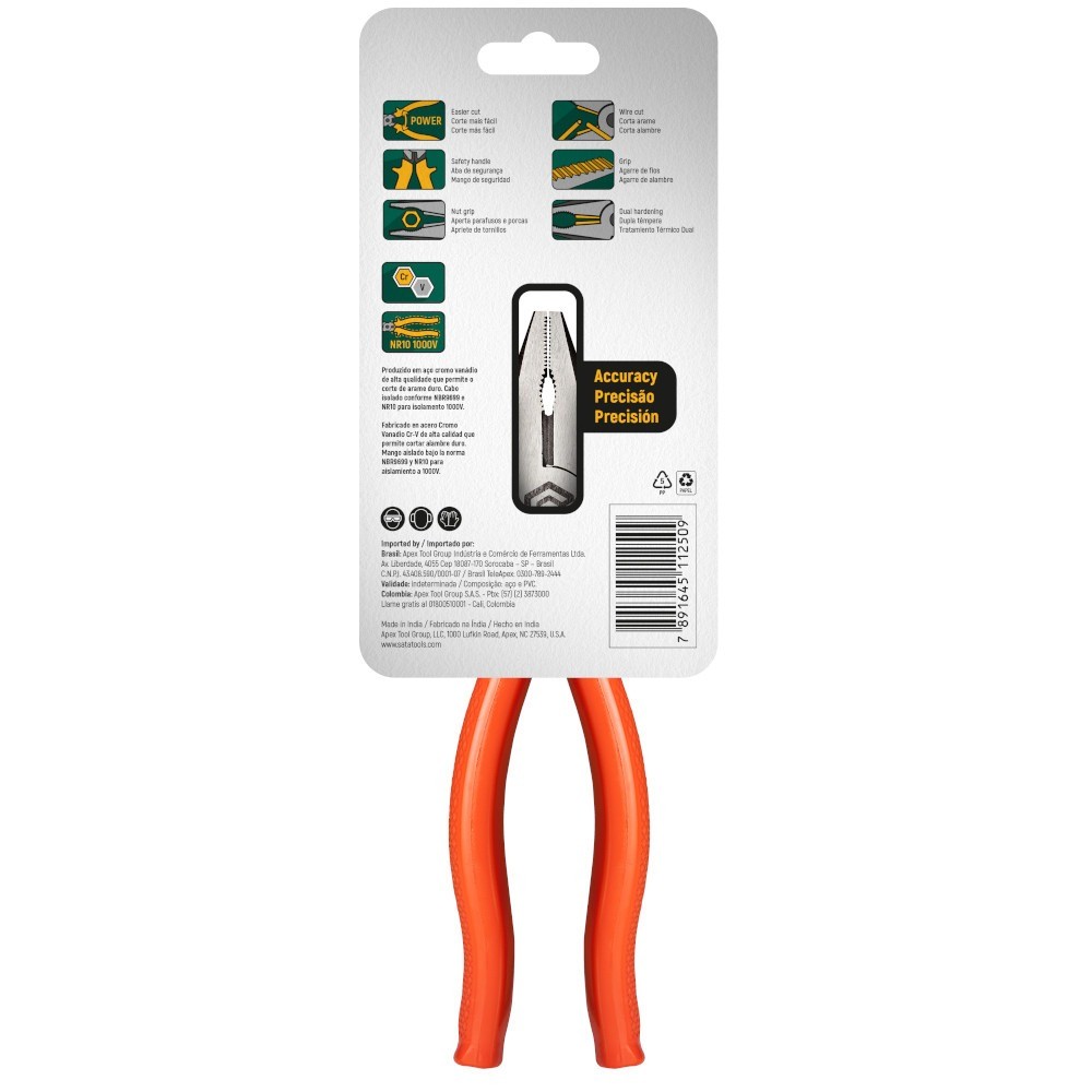 Produto: Alicate universal isolado 8" - ST700022L Marca: Sata Descrição: O Alicate universal isolado 8" da Sata possui uma durabilidade superior de corte. Utilizado em todos os setores de manutenção como: tubulações, eletricistas, mecânicos, industriais, construção civil, automotivo entre outros. Para realização de compressão, torção, extração e corte de objetos. Este Alicate Universal Isolado da Sata é o modelo mais versátil, possibilitando realizar diversas funções como: segurar, puxar, prender , descascar e cortar fios, realizar compressão e extração de objetos. Características e Benefícios - Durabilidade do corte superior - Oferece mais resistência a óleo e alta durabilidade: dupla têmpera no corpo e têmpera especial no corte. - Resistente a óleo. - Mais conforto e segurança: cabo ergonômico e com abas protetoras. - Cabo em PVC é mais fácil de limpar. - Fabricado em Aço Cromo-Vanádio (Cr-V) para maior durabilidade e resistência. - Cabo isolado até 1000V e NR10 de acordo com a norma ABNT NBR 9699 · Especificações: Comprimento: 8" Capacidade de corte: Arame mole: Ø 2,5mm Arame duro: Ø 1,6mm Material: Aço Cromo-Vanádio Normas: NBR 9699. Esta Norma aplica-se a ferramentas manuais isoladas e isolantes usadas para trabalho em instalações elétricas energizadas ou peças. Isolação do cabo para 1000v NR 10. Garantindo a segurança do usuário profissional em instalações e serviços de eletricidade. Dimensões (C x L x A): 21.50 x 5.50 x 3.00 centímetros Peso: 0.40 Kg