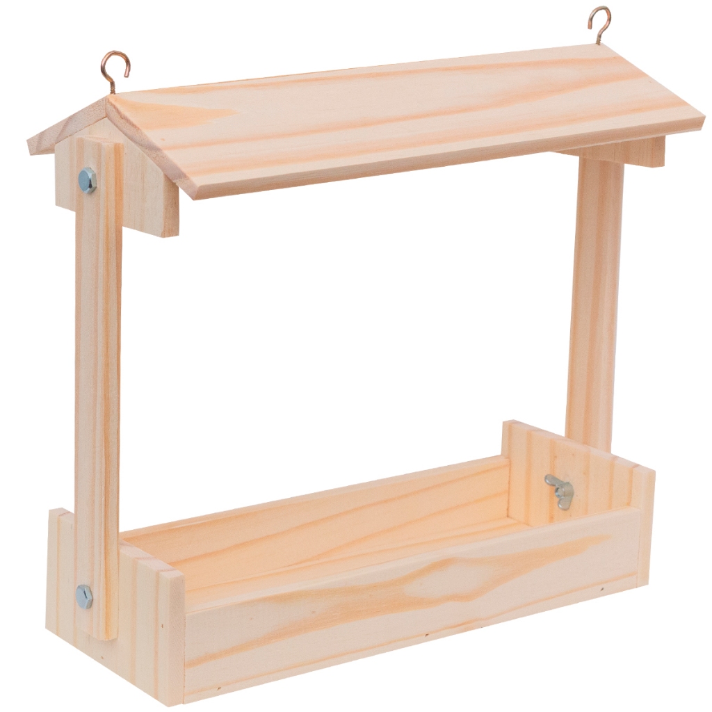 Ideal para tratar animais em ambiente aberto Casa , Sítios , Chaçarás , Asilos , Casa de recuperação etc..... Produto feito em madeira pinus , Parafuso com porcas e arroelas , granpos e dois ganchos para pendurar. Tratador aberto para colocação de alimentos, rações em geral ,para tratar animais soltos e mansos. Traz um aspecto da natureza mais perto de você e ao mesmo tempo colabora com a natureza dando alimento aos animais de sua região. Produto vai montado e embalado em caixa sobre medidas ,entrega imediata após a confirmação de compra ,produto em estoque . MEDIDADS TRATADOR GRANDE Largura Do Teto 20 cm Comprimento Do Teto 32 cm a parte que coloca o alimento tem 14 cm largura e 32 cm de comprimento altura tem 30 cm . Fico a disposição