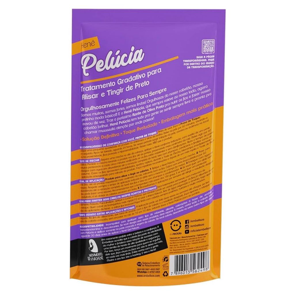 Alisante Henê Gel Pelúcia Forte Pouch 180g Embelleze - 1 Unidade Somos muitas, somos fortes, somos lindas! Orgulhosas do nosso cabelão, nosso pretinho nada básico! E o Henê Pelúcia, que sempre esteve ao nosso lado, agora inovou de vez. Traz o puríssimo Azeite de Oliva Preta pra nutrir os fios e fazer nosso cabelão brilhar. Possui a ação de alisar e tingir de preto e é indicado para todos os tipos de cabelos, Henê Pelúcia tem tudo pra gente se sentir sempre livre e pronta para chamar muuuuuita atenção por onde passar!! Como Aplicar: 1 - Aplique o Henê Pelúcia, mecha por mecha. 2 - Puxe com pente fino, da raiz às pontas, esticando bem os fios. Cubra com uma touca plástica por 60 minutos (o efeito será o mesmo se o tempo for maior). 3 - Enxágue bem os cabelos e lave-os com shampoo e condicione. 4 - Se você quer um efeito bem liso, pode fazer uma escova. E se você quer um penteado ondulado, é só deixar os cabelos secarem em bobs. 5 - Aconselhamos 2 aplicações por semana até atingir o resultado desejado. Retoque: Ao fim do alisamento, que varia de acordo com o tipo de cabelo e o resultado desejado, faça apenas o retoque na raiz de 15 em 15 dias, evitando levar o Henê Pelúcia para as pontas. Resultado: Cabelão liso escorrido, preto e com brilho pra lacrar!