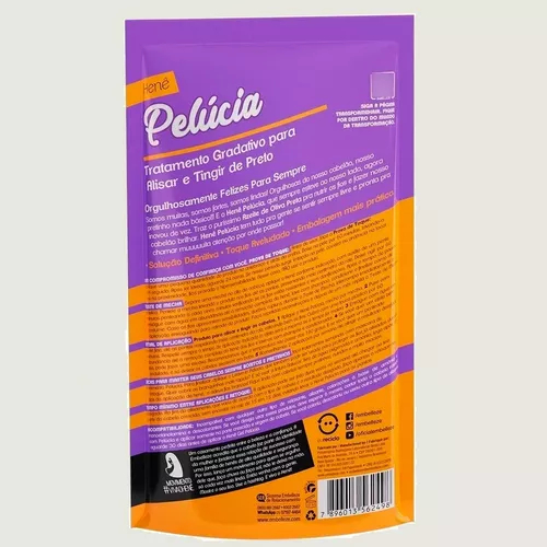 Somos muitas, somos fortes, somos lindas! Orgulhosas do nosso cabelão, nosso pretinho nada básico! E o Henê Pelúcia, que sempre esteve ao nosso lado, agora inovou de vez. Traz o puríssimo Azeite de Oliva Preta pra nutrir os fios e fazer nosso cabelão brilhar. Henê Pelúcia tem tudo pra gente se sentir sempre livre e pronta para chamar muuuuuita atenção por onde passar! Características: INDICAÇÃO Indicado para todos os tipos de cabelos. AÇÃO Alisa e tinge de preto. ATIVOS Azeite de Oliva Preto. BENEFÍCIOS Nutrição e megabrilho. Solução definitiva, toque aveludado e embalagem mais prática. Dê adeus à chapinha, escova e secador. RESULTADO Cabelão liso escorrido, preto e com brilho pra lacrar! MODO DE USO Como Aplicar 1 - Aplique o Henê Pelúcia, mecha por mecha. 2 - Puxe com pente fino, da raiz às pontas, esticando bem os fios. Cubra com uma touca plástica por 60 minutos (o efeito será o mesmo se o tempo for maior). 3 - Enxágue bem os cabelos e lave-os com shampoo e condicione. 4 - Se você quer um efeito bem liso, pode fazer uma escova. E se você quer um penteado ondulado, é só deixar os cabelos secarem em bobs. 5 - Aconselhamos 2 aplicações por semana até atingir o resultado desejado. Retoque Ao fim do alisamento, que varia de acordo com o tipo de cabelo e o resultado desejado, faça apenas o retoque na raiz de 15 em 15 dias, evitando levar o Henê Pelúcia para as pontas. Antes de aplicar faça o Teste de Mecha Separe uma mecha no alto da cabeça, aplique o Henê conforme indicação, com auxílio de um pente plástico. Penteie a mecha levando o produto nos fios até as pontas, preservando meio centímetro da raiz. Deixe agir por uma hora penteando a cada cinco minutos verificando se os fios estão resistentes e sem danificações. Após o tempo de pausa, enxágue completamente todo o Henê dos fios, lave com shampoo, condicione e finalize como de costume. Caso os fios apresentem sensibilidades, quebra, ruptura, durante o Teste de Mecha, interrompa imediatamente a aplicação. Faça repetidas reconstruções e depois de um mês repita o Teste de Mecha. COMPOSIÇÃO AQUA, ZEA MAYS STARCH, MANIHOT UTILISSIMA STARCH, AMMONIUM CHLORIDE, PYROGALLOL, CUPRIC CHLORIDE, PARFUM, SODIUM BENZOATE, FERROUS SULFATE, SODIUM HYDROXIDE, OLEA EUROPAEA FRUIT OIL, CI 77266.