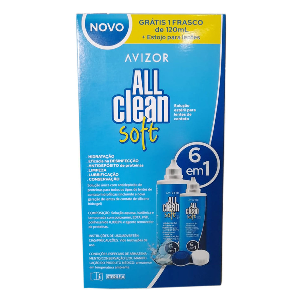 All Clean Soft 6 em 1 kit Solução Para Lentes 350ml + 120ml A Solução All Clean Soft 6 em 1 se aplica para todos os tipos de lentes de contato hidrofílicas, incluindo a nova geração de lentes de silicone hidrogel. Tem por principais objetivos limpeza, desinfecção, lavagem, conservação e hidratação, além de eliminar depósitos de proteína e lípidios que se acumulam nas superfícies das lentes de contato. A Solução Multiuso Avizor All Clean Soft 6 em 1 é ideal para quem busca um cuidado completo e eficaz com suas lentes de contato. Sua fórmula avançada oferece hidratação, desinfecção, remoção de depósitos de proteínas, limpeza, lubrificação e conservação, garantindo máxima proteção e conforto para os olhos. Adequada para lentes de contato gelatinosas e silicone hidrogel, esta embalagem promocional inclui 470ml + ganhe 120ml e um estojo para lentes, proporcionando praticidade no uso diário. Mantenha suas lentes sempre limpas e confortáveis com a qualidade Avizor!