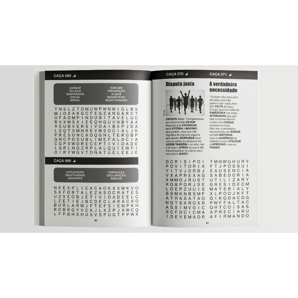 Com estes 365 desafios, além de muita diversão, também há muita reflexão sobre os ensinamentos atemporais de filósofos como Zenão, Sêneca, Marco Aurélio e outros. Esta experiência única combina entretenimento e filosofia, oferecendo um desafio diário que aprimora a sua mente e o seu espírito. Descubra a sabedoria oculta nas palavras enquanto fortalece sua compreensão do estoicismo. Esta edição é mais do que um livro de passatempos é um guia para uma vida mais sábia, simples e resiliente.