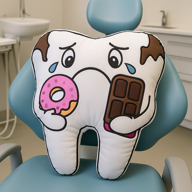 Almofada 3D dente com escova e dente com chocolate, decoração dentista, consultório, presente