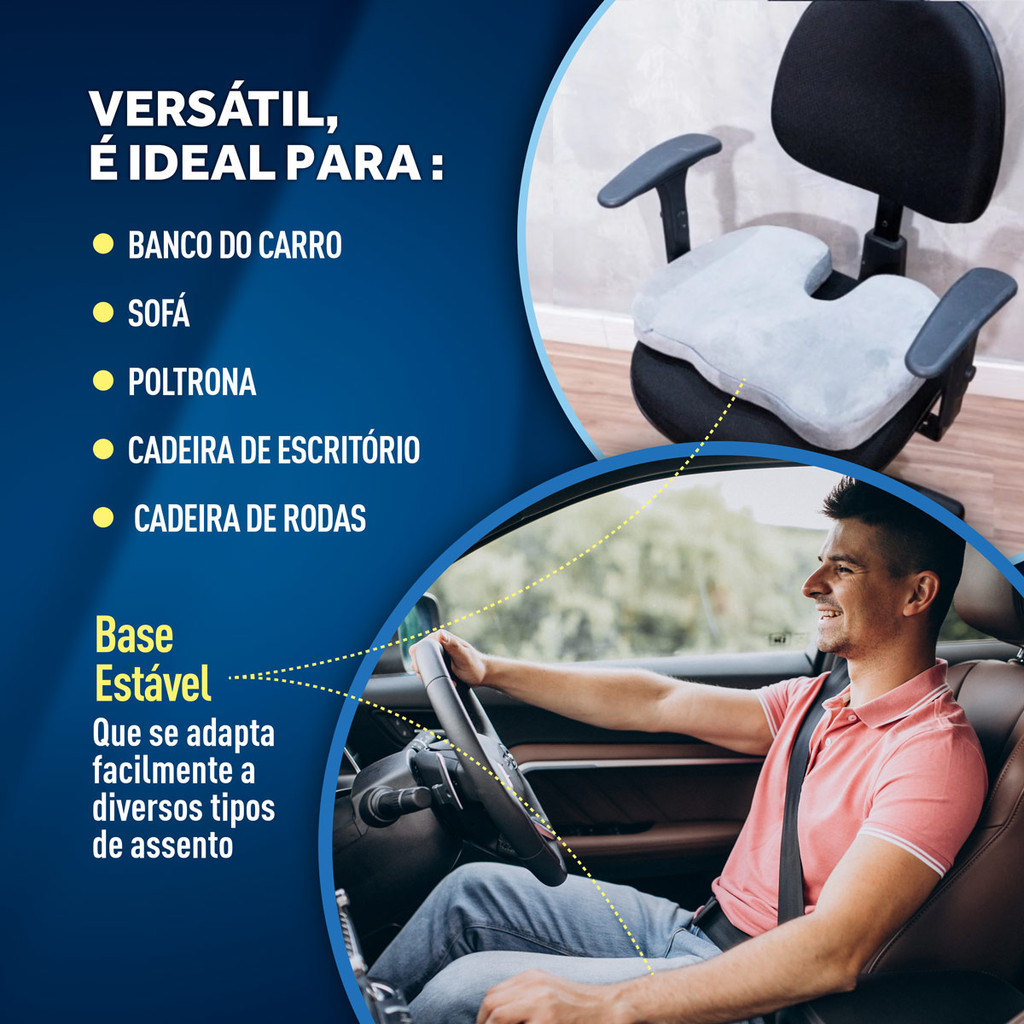 Chega de dores e desconfortos após passar muitas horas sentado! A Almofada Cóccix Gel foi especialmente desenvolvida para proporcionar mais comodidade ao sentar-se, tirando a pressão da região do cóccix. Versátil, pode ser colocada de forma estável sobre diversos tipos de assentos, como: banco do carro, sofá, poltrona, cadeira de escritório e cadeira de rodas. Com design anatômico, possui um recorte na parte traseira que evita a pressão na região do cóccix, proporcionando alívio para dores e tensões. A tecnologia Cool Gel, mantém a temperatura do corpo fresca e calma. Feita em visco elástico, é a combinação perfeita entre o conforto da espuma com memória, que evita deformações, e o frescor da camada de gel. Durável, leve e portátil, é o produto ideal para tornar mais agradáveis os longos períodos sentado, ajudando, inclusive, na correção da postura. BENEFÍCIOS DO ASSENTO ORTOPÉDICO CÓCCIX GEL DR. COLUNA - Traz conforto e alívio de dores para quem dirige longas distâncias, trabalha muitas horas sentado, quer evitar feridas de pressão ou está em pós-operatório ou pós-parto; - Proporciona bem-estar para cadeirantes; - Ajuda a reduzir o calor do corpo, mantendo a temperatura fresca e calma através da tecnologia COOL GEL; - Auxilia na correção da postura. VANTAGENS DESTE PRODUTO Composição que une qualidade e tecnologia; Versátil: pode ser colocada de forma estável sobre diferentes tipos de assento; Portátil e fácil de carregar para usar onde quiser; Durável; Fácil de limpar: basta usar um pano seco para remover qualquer poeira; Possui capa removível e lavável. COMO UTILIZAR: - Escolha o local para colocar a almofada: sobre banco do carro, cadeira de escritório, poltrona, sofá, cadeira de rodas etc.; - Posicione a face aveludada virada para cima e com o recorte voltado para a parte traseira; - Sua almofada está pronta para ser utilizada pelo tempo que desejar! CARACTERÍSTICAS GERAIS DO PRODUTO: Dimensões: 45 x 35 x 7 cm Densidade da Espuma: 45D Interior: 71% Espuma Viscoelástica + 29% Gel Peso do produto: 0,75 kg Garantia: 1 ano Conteúdo da embalagem: 1 almofada e 1 manual do usuário