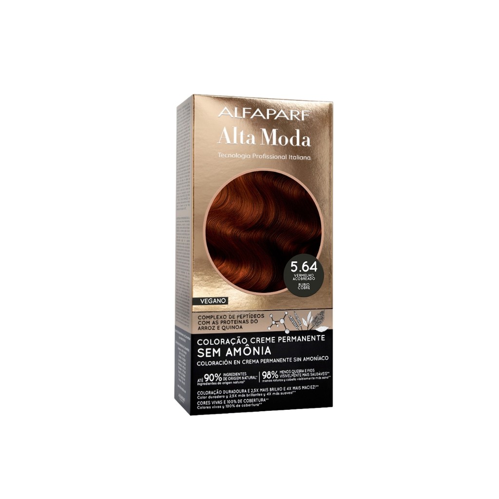 Descrição A Tintura Alta Moda Sem Amônia 5.64 Vermelho Acobreado foi especialmente enriquecida com peptídeo e com proteínas do arroz e da quinoa, que são verdadeiros aliados para saúde dos fios, pois penetram profundamente na fibra, melhorando a captação da cor e retendo-a por mais tempo. Além disso, possui cobertura duradoura e vibrante, sem qualquer dano á estrutura capilar, age diretamente no córtex transformando os pigmentos naturais. Cobre 100% dos fios brancos e possui fórmula vegana. Benefícios: - Livre de amônia; - Enriquecida com peptídeo; - Clareamento de até 3 tons; - Cobertura 100% de fios brancos. Modo de usar: Em um recipiente não metálico, coloque toda a bisnaga de coloração, mexa bem este creme puro para torná-lo uma massa. Aos poucos, adicione a emulsão e misture com o pincel até obter uma massa homogênea; Inicie a aplicação pela fronte ou pela região onde existe maior concentração de cabelos brancos, distribuindo a coloração por todo o cabelo; Deixe o produto agir. Após isso, com as mãos/luvas, massageie toda a cabeça e os cabelos por alguns minutos, garantindo a distribuição da coloração por todo o cabelo. Enxágue muito bem até a completa retirada da coloração. Sobre a marca: O Grupo Alfaparf está há mais de 30 anos no mercado internacional de cosméticos, atuando em 80 países e atendendo aos melhores salões do mundo. Com expertise na área capilar, o grupo iniciou sua atuação junto ao consumidor final no Brasil através da Alfaparf Cosmética Di Tratamento. Destaca-se pelo sucesso de suas linhas junto à mulher brasileira. ?