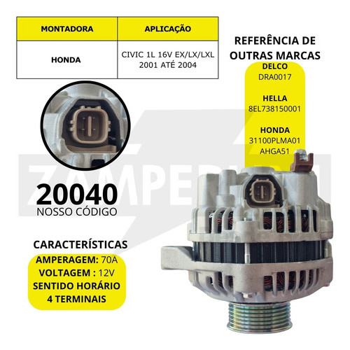 Alternador Honda Civic 1.7 2001 2002 2003 2004 - 12v 70ah