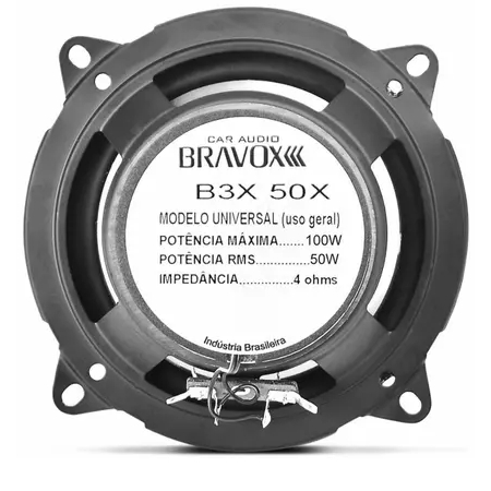 O Bravox B3X50X é um alto-falante automotivo triaxial de 5 polegadas, popular por ser um substituto direto para falantes originais, oferecendo um bom custo-benefício com 50W RMS (100W PMPO) e 4 Ohms, projetado para reproduzir graves, médios e agudos com qualidade para uso diário no carro. Características Principais: Tamanho: 5 polegadas (13 cm). Tipo: Triaxial (com woofer, médio e tweeter integrados). Potência: 50W RMS / 100W PMPO por falante (ou 100W RMS / 200W PMPO por par, dependendo do anúncio). Impedância: 4 Ohms. Resposta de Frequência: 70Hz - 20kHz (ou 60Hz - 20kHz). Sensibilidade: 89 dB (ou 92 dB). Material: Cone de polipropileno e borda em santoprene. Uso: Ideal para substituição de som original, portas dianteiras/traseiras, tampão do porta-malas, etc.. Vantagens: Instalação Fácil: Encaixe universal para a maioria dos veículos, sem necessidade de adaptações complexas. Qualidade Sonora: Reproduz um som equilibrado (graves, médios e agudos) para o dia a dia. Custo-Benefício: Considerado uma das melhores opções pelo preço e desempenho.