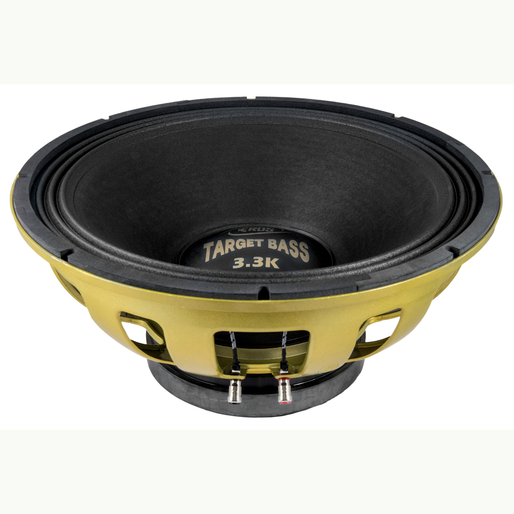 Projetado para oferecer subgraves e graves com alta potência o Target Bass 3.3k de 18 polegadas suporta 1.650 Wrms, com um novo design, conjunto motor maior 225mm x 25mm, bobina com quatro camadas de fio CCAW, dupla centragem, cone reforçado e borda especial desenvolvida para suportar o grande esforço mecânico, sem perder o timbre já consagrado. Especificações Técnicas • Potência Máxima (RMS): 1.650 W • Impedância Nominal: 8 Ohms • Resposta de Frequência: 30 ~ 1.000 Hz • Sensibilidade (@ 1 W, 1 m) - FREE-AIR: 95,78 dB • Diâmetro Nominal: 18 Polegadas • Diâmetro Ferrite: 225 X 25 mm • Material do Ferrite: Bário • Diâmetro da Bobina: 4 polegadas • Forma da Bobina: FIBERGLASS • Altura da Bobina: 29 mm • Altura do Gap: 14 mm • Material do Fio da Bobina: CCAW • Secção do Fio da Bobina: Redonda • Material da Carcaça: Aluminio