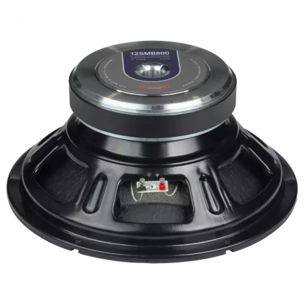 O 12SMB800 é um excelente custo-benefício – um alto falante profissional feito para sistemas que necessitam de custo reduzido, sem abrir mão da qualidade e desempenho. Ótimo equilíbrio entre graves e médios. Uma excelente opção como fullrange em caixas de 2 vias ou ainda como subwoofer, sendo capaz de reproduzir graves até 39Hz em caixas propriamente sintonizadas. Informações Técnicas • Potência máxima contínua: 400w • Impedância nominal: 8 Ohms • Resposta em frequência: 39 Hz a 4,5 kHz (3) • Sensibilidade: 96,4 dB SPL (1W@1m) • Diâmetro nominal: 12” • Diâmetro da bobina móvel: 3” (76 mm) • Material da bobina móvel: Fio retangular CCAW • Máxima excursão pico a pico: 31 mm • Diâmetro de corte do baffle: 277 mm • Volume ocupado pelo alto falante : 2,7 L • Peso líquido: 6,3 Kg • Peso com embalagem: 7,00 Kg • Dimensões da embalagem (LxAxP): 36 x 20 x 36 cm • Volume ocupado pela embalagem: 0,026 m³