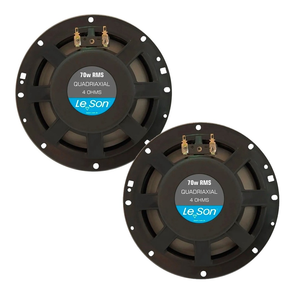 Alto Falante Leson 6 Polegadas 140W RMS Quadriaxial 4 Ohms Bobina Simples Par Detalhes do Produto O alto falante Leson de 6 polegadas foi desenvolvido especialmente para substituir os falantes originais do veículo, que normalmente não tem uma reprodução sonora tão fiel quanto os falantes Quadriaxiais, possuem 3 níveis de reprodução, alcançando com excelente qualidade de graves, médios e agudos. Compatibilidade Universal Modelo Disponível Leson 2LS070060 Especificações Técnicas Tamanho de 6 polegadas Potência de 140W RMS (par) Potência PMPO de 280W (par) Sistema Quadriaxial Impedância de 4 Ohms Sensibilidade: 87 dB/W/m Fo: 100 Hz Resposta de frequência: 37 a 20.000 Hz Cone injetado em polipropileno Bobina em corpo de alumínio Borda injetada em Santoprene Ímã de fluxo magnético Tweeter Mylar e Mid Range Ótimo acabamento Compatível com todos os modelos de veículos Medidas: 16cmx 16cmx 7cm Conteúdo da Embalagem 02 Alto Falantes Manual de instruções