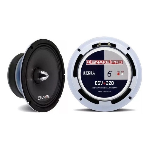 Alto Falante Snake ESV 220 6 Polegadas 220W Rms Som AutomotivoCaracterísticas:• O transdutor ESV – 220 é um Midrange de 6 polegadas que combina uma excelente linearidade com boa eficiência e capacidades de gerenciamento de energia;• O produto incorpora o melhor som com a qualidade e potência necessárias para fazer a diferença;• Exclusivo sistema de ajuste de fase aletado de alumínio montado sobre o polo central, de maneira efetiva atua nas altas frequencias e retira o calor gerado na bobina móvel, garantindo aplicação de potência;• Sistema magnético otimizado por computador (FEA) proporciona alto SPL e baixa distorção.Especificações Técnicas do Alto Falante:• Marca: Snake• Tamanho: 6 polegadas• Impedância nominal: 4 ohms• Resistência DC: 2 ohms• Potência máxima contínua RMS: 220w- corte em 100 Hz, 18dB/ oitava)• Potência de programa musical 440w• Sensibilidade: 95 dB SPL (1W/m)• Resposta em frequência: 60 Hz a 3 KHz• Fluxo magnético: 11.400 gauss• Diâmetro da bobina móvel: Fio CCAW ( copper clad aluminum)• Resposta de Frequência: 60 Hz 4 Khz• Dispersão: 90 cônico• Montagem: 4 furos com 4,5 mm ( H x V) 160x160mm• Dimensões da embalagem: 170x160mm• Peso: 3,820 kg (par)Conteúdo da Embalagem:• Par Alto Falantes Snake• Manual• Certificado de GarantiaImportante:• Garantia de 12 Meses contra defeito de fabricaçãoA Like Parts recomenda que a instalação seja feita por profissional especializado e não se responsabiliza pelo mau uso do produto.