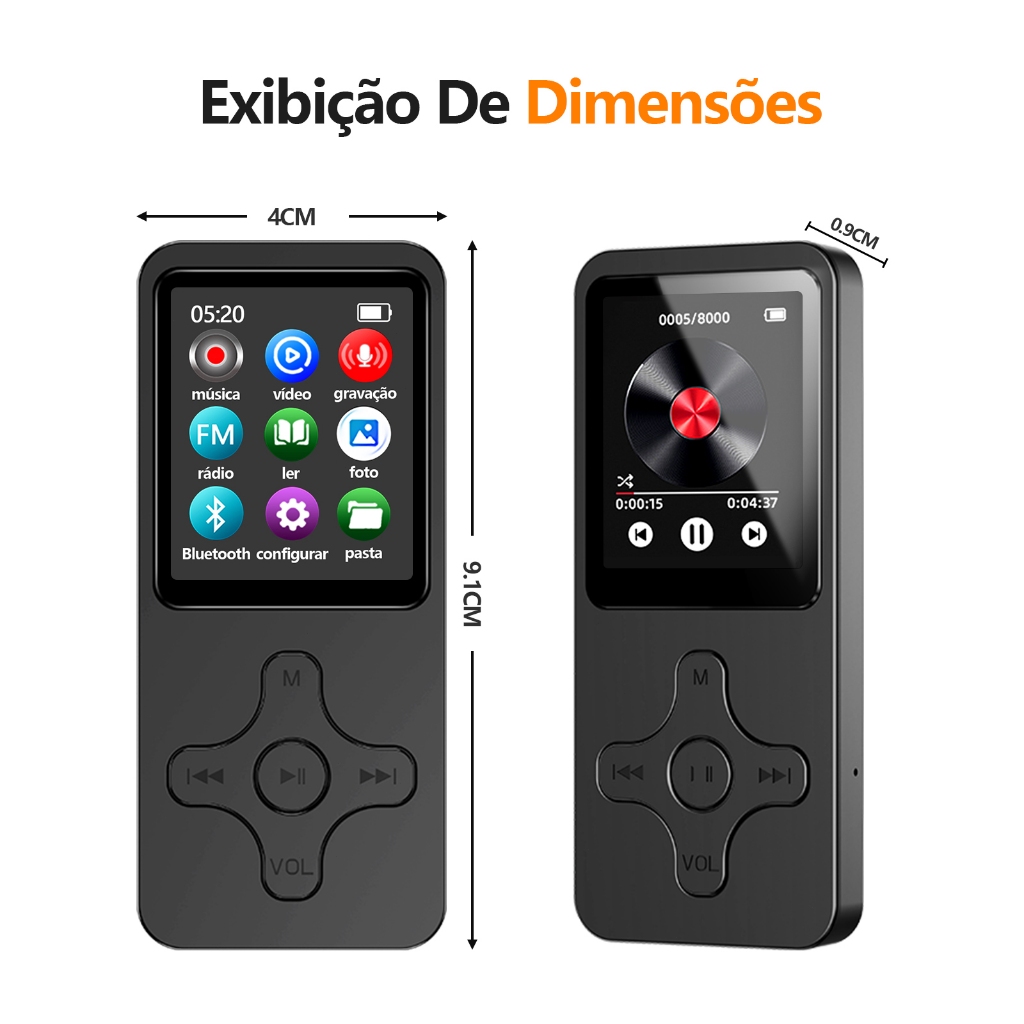 Função de gravador, gravação de voz controlada, suporte bluetooth, reprodução de música de vídeo, suporte de rádio, e-book, super grande capacidade 128GB, suporte inglês Dimensão total: 90.5mm * 39.5mm *10MM Peso do produto: sobre 31g Tela de exposição: 1, 77 polegadas 128*160 Bateria: bateria de lítio 250mAh/3.7v Especificação de carregamento: entrada 5V/1A Tempo de carregamento: cerca de 2 horas Versão bluetooth: 5.0 Distorção harmônica total: <0.4% Relação sinal/ruído: 75db@1khz,±3db Extensão do cartão TF: ≤128GB Exigência ambiental:-5℃ ~ 40℃ Formato audio: APE(compressão rápida /Normal, 800Kbps-1000kbps, taxa de amostragem 8KHz-48khz), FLAC(1000Kbps-1200kbps, taxa de amostragem 8KHz-48khz), MP3(8Kbps-320kbps, taxa de amostragem 8KHz-48khz), WMA(5Kbps-384kbps, taxa de amostragem 8KHz-48khz), WAV(32Kbps-1536kbps, taxa de amostragem 8KHz-48khz), AAC-lc (8Kbps-320kbps, taxa de amostragem 8KHz-48khz), Formato video: AVI 128*160(conversão da ferramenta da conversão) Formato de gravação: WAV Imagem: JPG/JPEG/BMP do apoio Formato e-book: documento TXT Relação: USB1.1, carregamento Saída analógica: saída analógica de 3.5m Alto-falante: 1W*8ohm Conteúdo do pacote: 1 x MP3 player 1 x cabo de carregamento 1 x manual de instruções 1 x Manual do Usuário 1 x Fones de ouvido com fio
