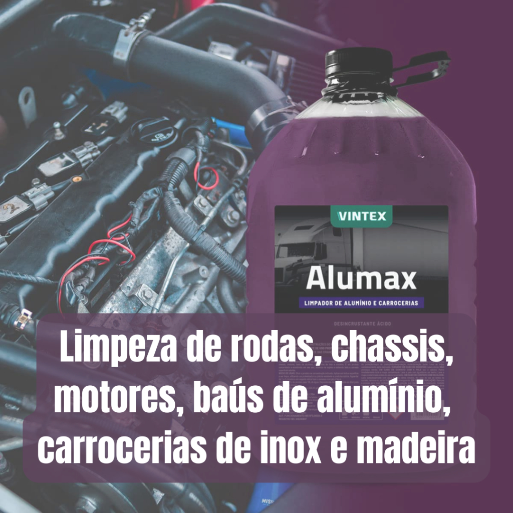 ALUMAX DESENGRAXANTE VINTEX 5litros Alumax é um desincrustaste de caráter ácido, desenvolvido para limpeza de rodas, chassis, motores, baús de alumínio, carrocerias de inox e madeira. É um produto concentrado e econômico em seu uso, atuando na sujeira e retirando toda a camada superficial aderida. Diluição: 1:10 (Obs: Dependendo da sujeira, pode-se diluir para mais ou para menos). Modo de usar: 1- Diluir o produto na concentração indicada; 2- Aplicar em toda a superfície a ser limpa, utilizando um pulverizador ou pistola resistente a produtos ácidos; 3- Aguardar de 1 a 2 minutos e em seguida retirar bem o excesso com jato d’água. * Envio em até 24 horas: Garantimos agilidade no envio para que você receba seu pedido o quanto antes. * Nota fiscal: Todos os produtos acompanham nota fiscal para sua segurança e confiança. * Atendimento online: Estamos disponíveis para tirar suas dúvidas. Utilize o chat e fale diretamente conosco. * Sobre a loja: Aqui você encontra uma grande variedade de produtos com qualidade e preços acessíveis. Não perca tempo, compre com quem entrega de verdade!