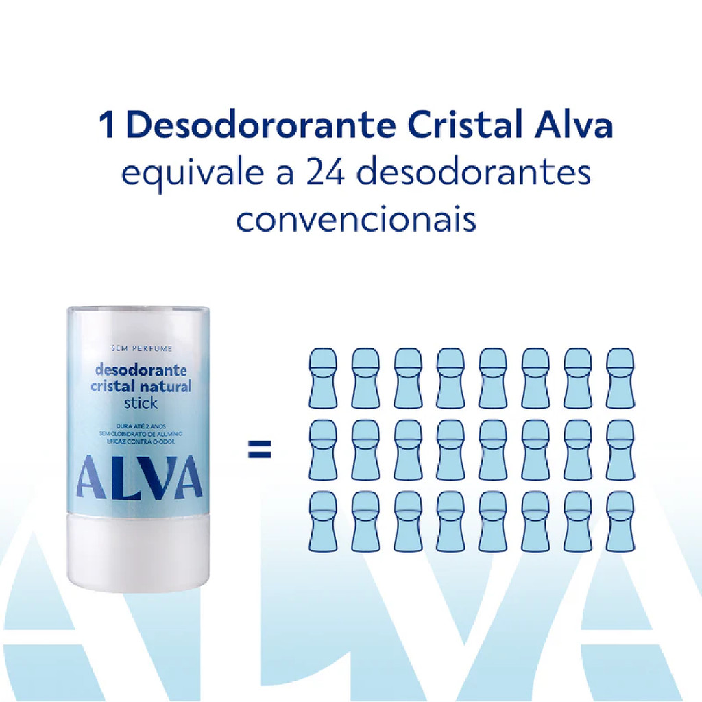 INFORMAÇÕES DE DESTAQUE Sem manchas nas roupas Proteção natural por até 12 horas Duração estimada de até 2 anos Menos 24 embalagens descartadas no meio ambiente em 2 anos DESCRIÇÃO O Cristal Alva é uma alternativa de desodorante natural, com fórmula à base de alúmen de potássio, mineral conhecido por suas propriedades adstringentes. Seu uso contínuo pode proporcionar proteção eficaz contra odores sem obstruir os poros, permitindo a transpiração natural da pele. Produto com longa durabilidade, contribuindo para redução de resíduos plásticos no meio ambiente. COMPOSIÇÃO Potassium Alum (Alúmen de potássio). NÃO CONTÉM GLÚTEN. MODO DE USO Umedeça o cristal com água. Aplique nas axilas limpas. Aguarde secar antes de se vestir. Após o uso, seque o cristal com toalha e armazene em local seco e arejado. Reaplique conforme necessário. Cuidados de Armazenamento: Evite deixar em superfícies de mármore ou granito para prevenir manchas. Em caso de quebra, o produto ainda pode ser utilizado. Utilize uma saboneteira ou superfície seca para armazenagem.