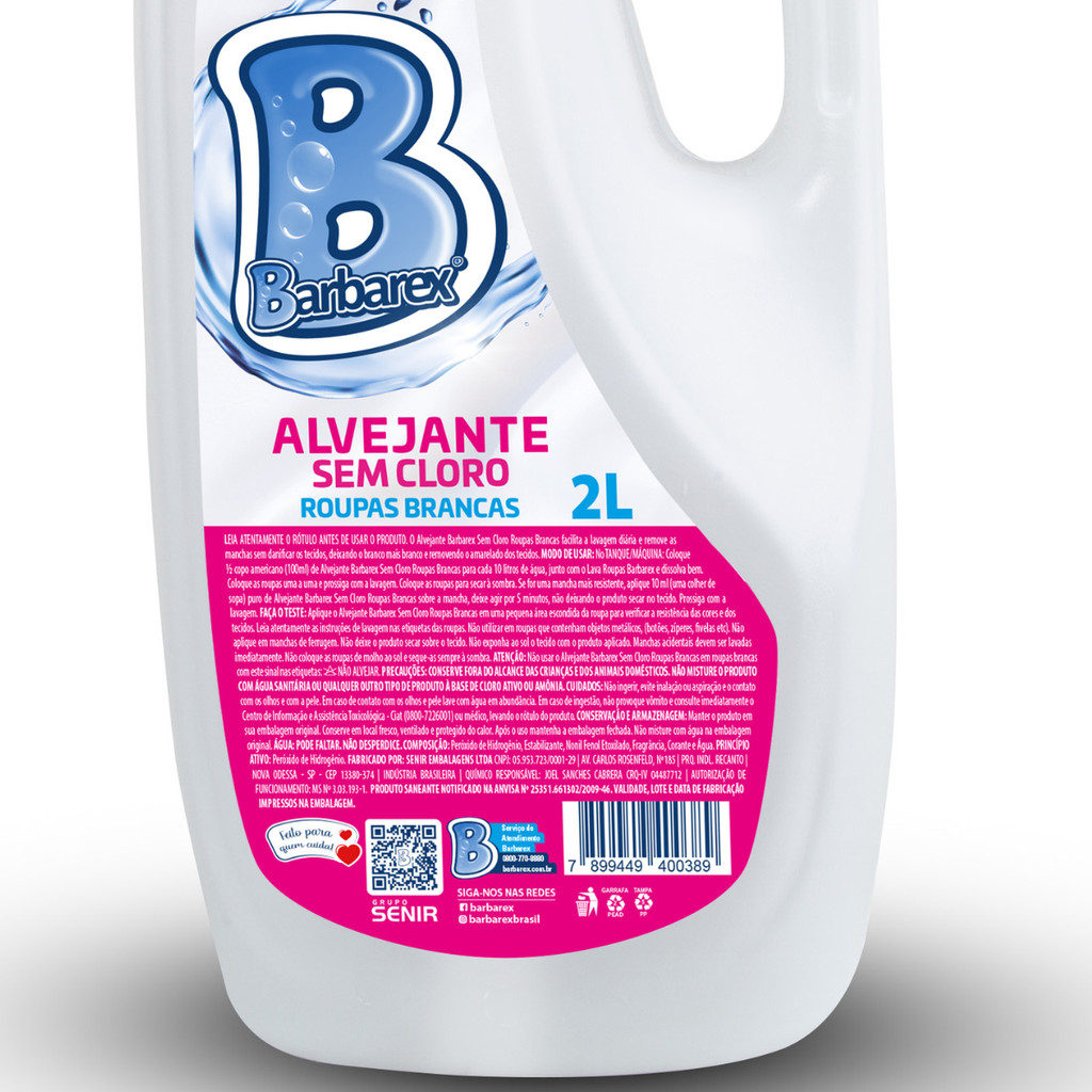 Alvejante sem Cloro 3 em 1 Barbarex 2 litros O Alvejante sem Cloro Barbarex é ideal para remover resíduos de batom, café ou chá das toalhas de mesa e guardanapos. Para melhores resultados, deixe os itens de molho no alvejante por no mínimo duas horas. Em seguida, lave normalmente. Esse procedimento ajuda a garantir que as manchas mais difíceis sejam eliminadas, devolvendo a aparência original dos tecidos. Recomendações de Armazenamento: Mantenha o produto na embalagem original. Armazene em local fresco, seco, e protegido da luz direta e calor excessivo. Detalhes do Produto: Embalagem: 2 litros