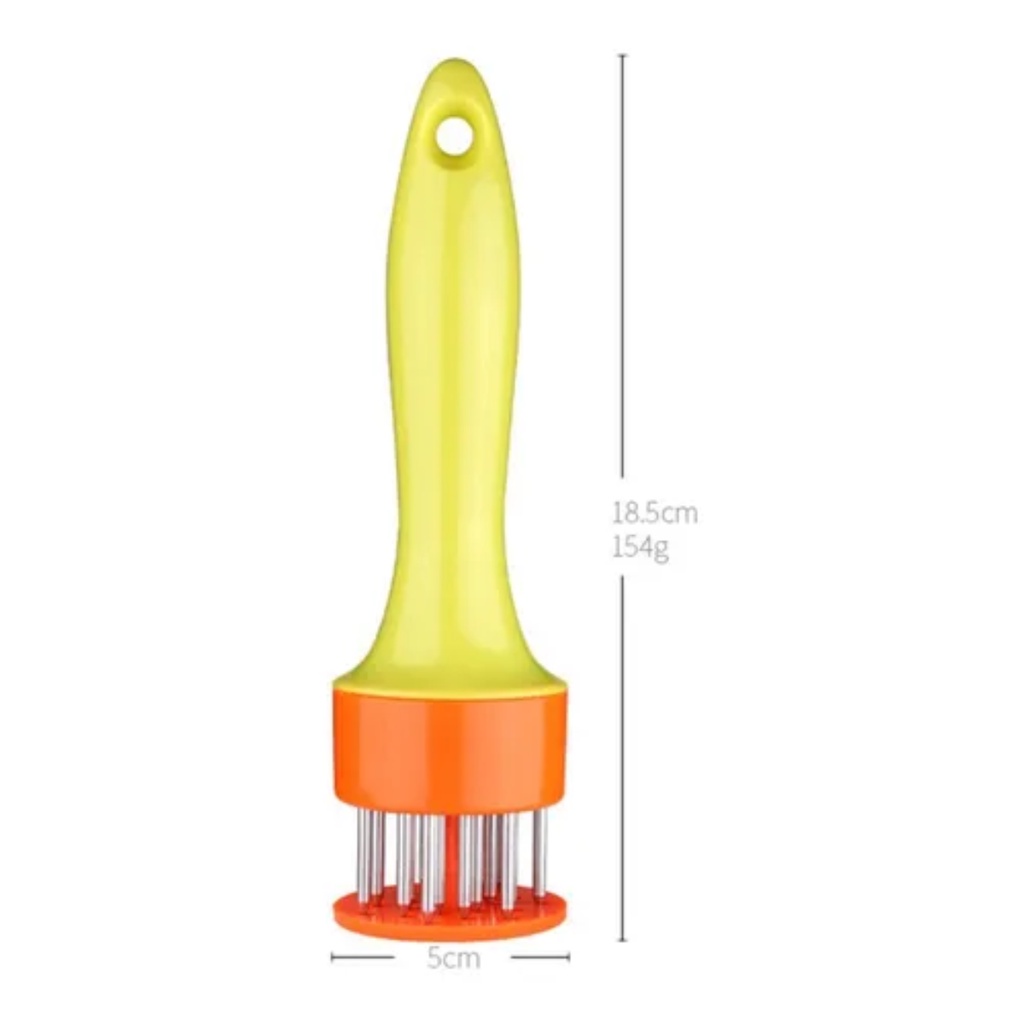 Amaciador e Batedor De Carne com furador manual de Aço inox !!!! Produto totalmente seguro e funcional !!!! Prático e fácil de usar, produto inovador que atinge a fibra da carne dura ao forçar para baixo, amaciando o alimento sem prejudicar sua textura !!!! INFORMAÇÕES DO PRODUTO Plástico Alta Qualidade/ Aço Inox Dimensões: 5cm x 5cm x 19cm (Largura x Diâmetro x Altura)