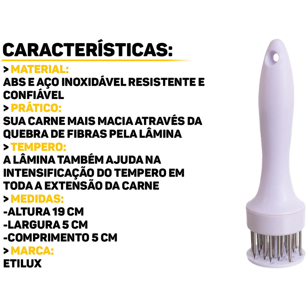Amaciador Para Carne Com 24 Agulhas Western O Amaciador Para Carnes é um utensílio ideal para garantir carnes mais macias, proporcionando uma experiência gastronômica ainda mais saborosa. O amaciador penetra nas fibras da carne, garantindo uma carne mais macia e intensificando assim o tempero e introduzindo em toda a carne. Características: > Garante que a carne fique macia sem perder seu formato ou estrutura; > Suas agulhas e o cabo são fáceis de limpar, permitindo higienização rápida após o uso; > Fabricado com materiais de alta qualidade, resistente à corrosão e desgaste, garantindo longa durabilidade; > Cabo confortável e seguro, que facilita o manuseio durante o uso, proporcionando mais controle e praticidade. Especificações Técnicas: > Material: aço Inoxidável e ABS; > Dimensões do produto (C x L x A): 19cm x 5cm x 5cm. - Marca: Western - Garantia: 90 dias contra defeitos de fabricação Vantagens de comprar na Brester: - Produto a pronta entrega. - Produto novo, com garantia de fábrica. - Nota fiscal para Pessoa Física e Pessoa Jurídica.