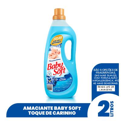 1.Vantagens Os Amaciantes Baby Soft dão aquele tratamento especial que as suas roupas merecem, além de renderem muito mais. São 5 opções de fragrâncias, das mais suaves, com elementos hipoalergênicos, até as mais sensoriais. 2.Características do produto (medidas/especificar quando houver variação do mesmo produto) A Gtex Brasil sempre dedicou atenção especial à Baby Soft por uma simples razão: ela quer que você esteja com as suas roupas sempre impecáveis! Para isso, desenvolveu um conjunto de produtos que vai fazer da sua tarefa de cuidar das roupas um momento especial! Os produtos Baby Soft possuem uma fórmula que garante suavidade na roupa lavada e um perfume gostoso que dura por muito mais tempo. Se você busca saber qual amaciante é melhor, eu conto pra você! Existem os amaciantes diluídos e os concentrados, e Baby Soft oferece os dois pra você! O amaciante tradicional ou clássico é aquele encontrado com mais facilidade nas prateleiras. Ele é diluído em água e, geralmente, vem em garrafas de 500ml a 5 litros. É um dos tipos mais práticos para o dia a dia, já que vem pronto, ou seja, basta acrescentar à sua lavagem. Já a versão concentrada do produto é também líquida, porém mais espessa do que o amaciante tradicional. O seu nome se dá porque ele tem menos água na sua fórmula, portanto, o produto é mais puro, logo, mais concentrado. Ele rende uma quantidade maior de lavagens do que a sua versão diluída e, por conta da concentração, deve ser usado em quantidades menores. Detalhes técnicos: Unidade: Embalagem com Amaciante Diluído Baby Soft Toque de Carinho 2L Dimensões da embalagem: 12,3cm(L)x 6,9cm(P)x32cm(A) Vida útil: 24 meses 3.Composição (do que é feito o produto)/ Especificações técnicas Tensoativo Catiônico Coadjuvantes Acidificante Conservante Corantes, Fragrância Água Contém Sal Quaternário De Amônio. Características do Produto 4. Modo de usar (o da embalagem) Após uma operação de lavagem, dissolver em separado 2 tampas de Baby Soft. Deixar agir por 10 minutos e depois completar o processo. ** Especificado para máquina com capacidade de 10kg, nível baixo de água. Para as demais, adequar a dosagem. 5. Dica de Gê 4 Dicas que você precisa saber na hora de lavar roupas com Baby Soft: Separar toalhas dos restantes das roupas Lingerie precisa ser colocada dentro de um saquinho especial para lavagem Usar as medidas corretas de sabão e amaciante Use os Amaciantes Baby Soft! Dica bônus! Se você quer uma lavagem completa, preservando o tecido das suas roupas, utilize também o Lava Roupas Baby Soft!