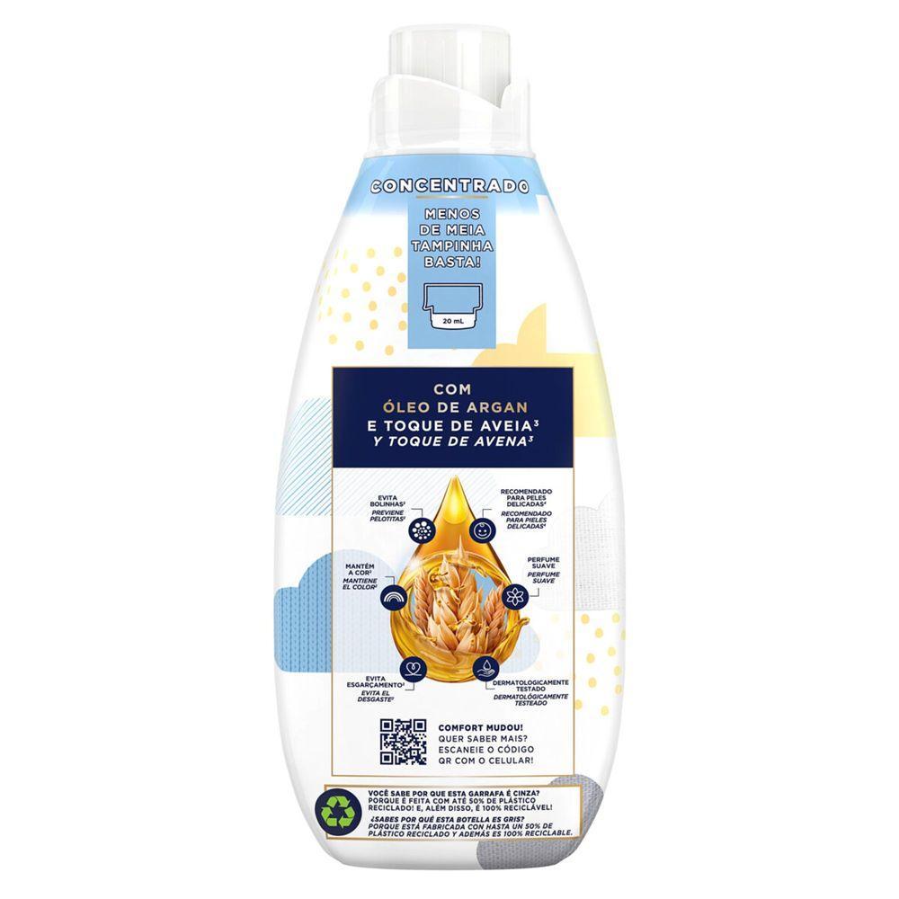 • O Amaciante Concentrado Comfort Puro Cuidado foi especialmente desenvolvido para peles sensíveis e delicadas, sendo dermatologicamente testado • A nova fórmula contém óleo de argan que previne os danos da lavagem, mantendo as cores dos tecidos vibrantes e evita a formação de bolinhas e esgarçamento**. Garante maciez e suavidade aos tecidos • Com um toque de aveia* que traz carinho e delicadeza até para as peles mais sensíveis, seguro para usar nas roupas de bebê • O Amaciante Concentrado Comfort Puro Cuidado tem um perfume suave e é hipoalergênico, recomendado para peles delicadas*** • A embalagem deste amaciante é feita com 50% de plástico reciclado, diminuindo assim o impacto ambiental • O Amaciante Concentrado Comfort possui uma embalagem econômica LEVE MAIS E PAGUE MENOS que rende mais de 4 L, o equivalente a 50 lavagens****. Menos de meia tampinha basta para lavar suas roupas! O Amaciante Concentrado Comfort Puro Cuidado tem perfume suave com extrato de aveia, recomendado para peles delicadas*** e faz as roupas durarem muito mais! Sua nova fórmula contém óleo de argan, um óleo natural com alto potencial nutritivo, que previne os danos da lavagem, mantendo as cores do tecido vibrantes por mais tempo, evitando a formação de bolinhas e esgarçamento**. Este amaciante de roupas contém extrato de aveia* que penetra profundamente nas fibras do tecido durante a lavagem, deixando-as com uma maciez irresistível, toque gentil e com todo cuidado que as peles sensíveis merecem. É livre de corantes e das microcápsulas de perfume, componentes com alto potencial de irritabilidade para as peles mais delicadas. Os ingredientes de Comfort Concentrado conseguem alinhar e proteger o tecido, reduzindo o atrito entre as fibras de suas roupas durante o processo de lavagem. Sua fórmula além de ser hipoalergênica é dermatologicamente testada por pediatras, dermatologistas e outros profissionais da saúde. Dessa forma, O Amaciante Concentrado Comfort Puro Cuidado é indicado para ser usado em roupas de bebês e de pessoas com peles sensíveis e delicadas. A embalagem do amaciante Comfort Concentrado é feita com pelo menos 50% de plástico reciclado, contribuindo assim para a diminuição do impacto ambiental. É uma embalagem econômica LEVE MAIS E PAGUE MENOS que rende mais de 4 L, o que corresponde a 50 lavagens****. Menos de meia tampinha de Comfort concentrado basta para lavar suas roupas. *Com extrato de aveia na composição da fragrância. **Benefícios de tratamento do amaciante obtidos versus roupa lavada sem amaciante. ***Produto amaciante para roupas, hipoalergênicamente testado. Desenvolvido para lavar roupas de pessoas com pele delicada. ****Considerando recomendação de dosagem para máquinas até 8 kg (20 ml).